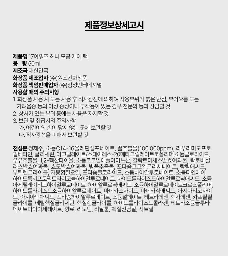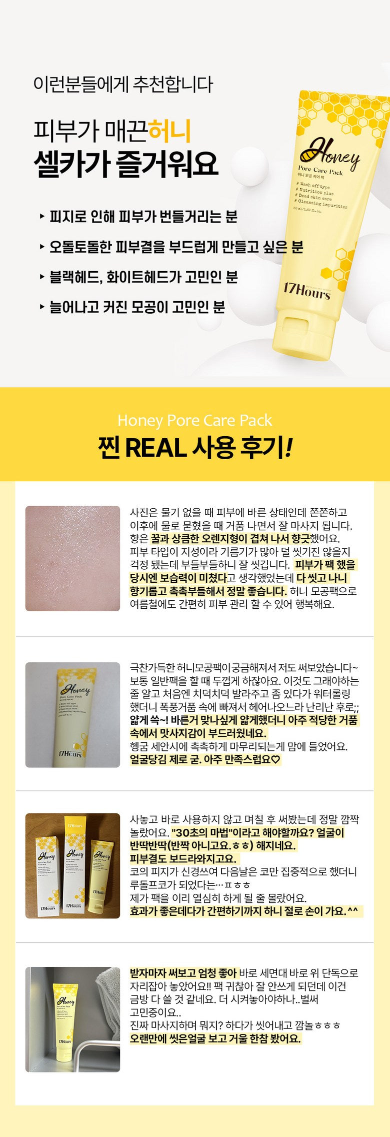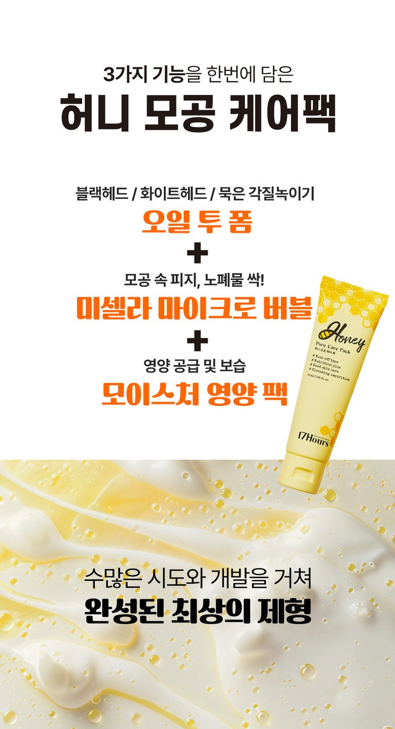 Alright, y’all. So I tried the 17Hours Honey Pore Care Pack and let me tell you, it’s a game-changer! I usually battle with oily skin and those pesky blackheads, but this wash-off pack was super quick—like two minutes max! The honey extract in there really does wonders for hydration; my skin felt so smooth after rinsing off. It definitely tightens up those pores too! Honestly, if you’re like me and want an easy skincare fix without spending ages on it, give this baby a shot. Solid find!
