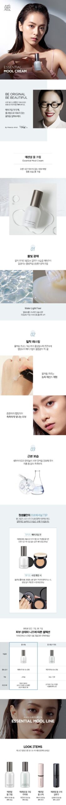 TIP 01. Pre-Makeup Application: For enhanced makeup endurance, finish your skincare routine with Mool Cream. Apply cushion foundation over it to achieve a veiled, long-lasting effect on your skin. TIP 02. Makeup Retouching: When touching up your makeup, blend a small amount of Mool Cream with your cushion foundation. This combination helps refresh your makeup without any caking.