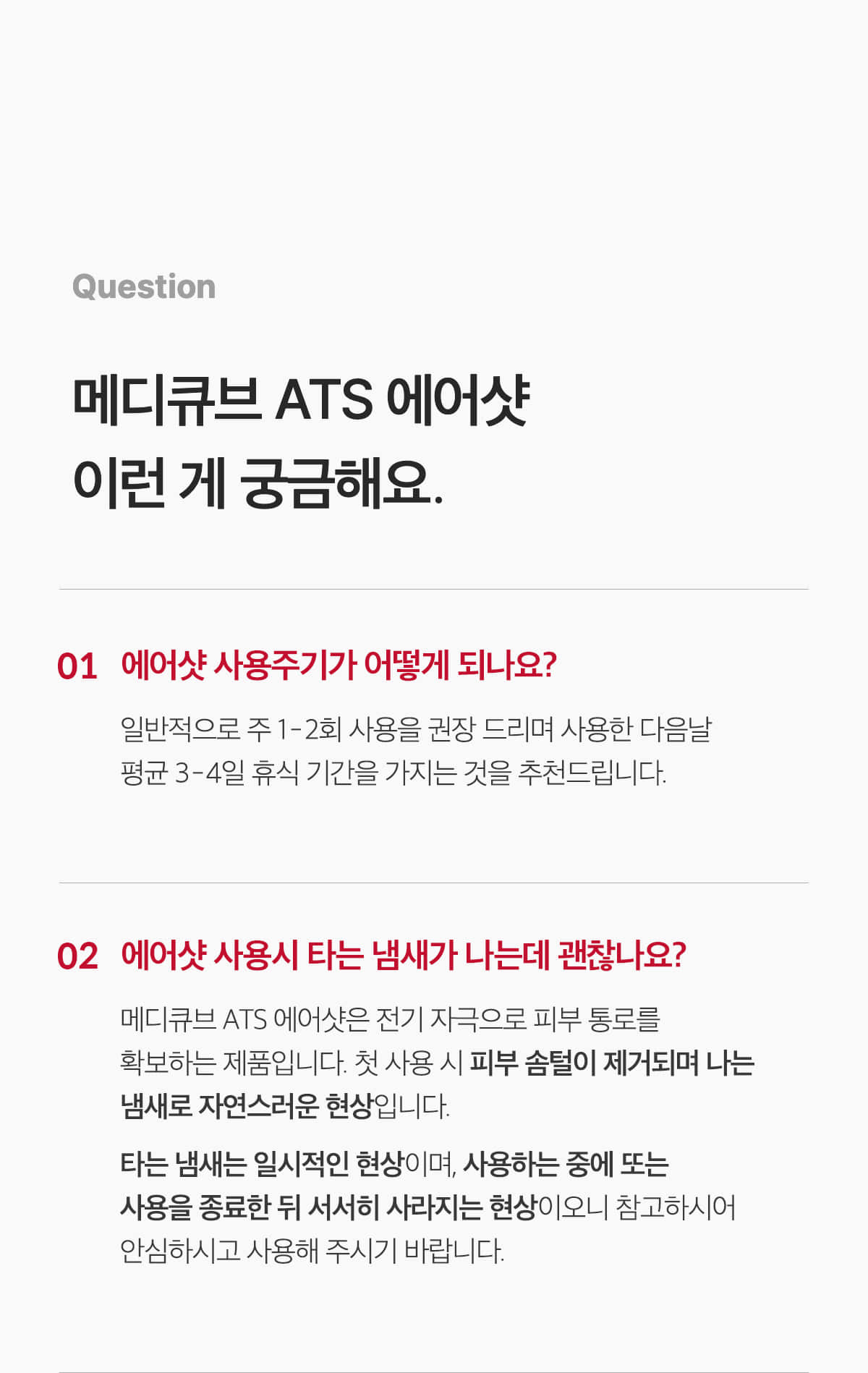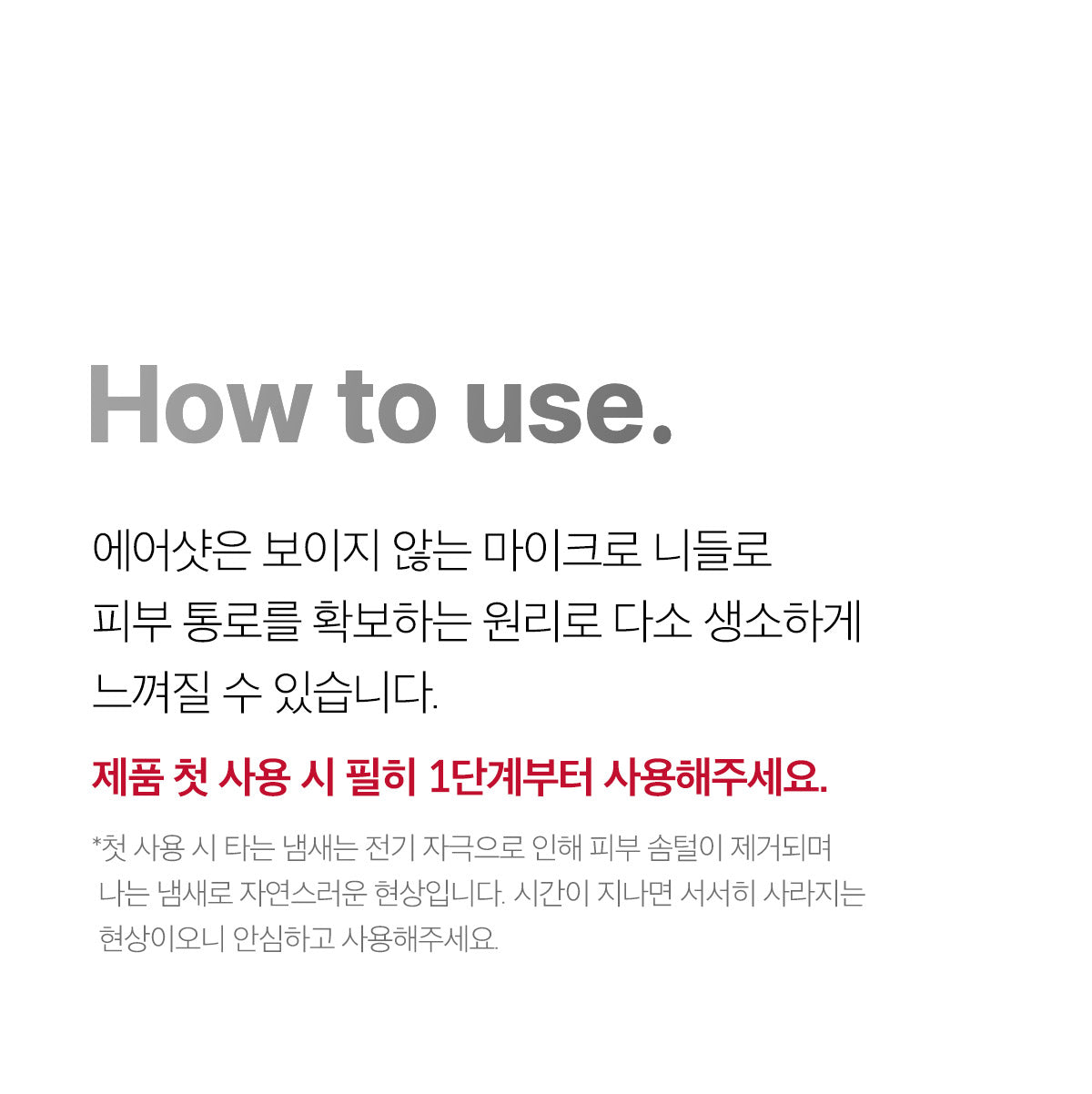 – When using the product for the first time, be sure to start from step 1. The smell of burning at the time of first use is a natural phenomenon that occurs when hairs are removed from the skin due to electrical stimulation. It will gradually disappear over time, so please use it with confidence.
