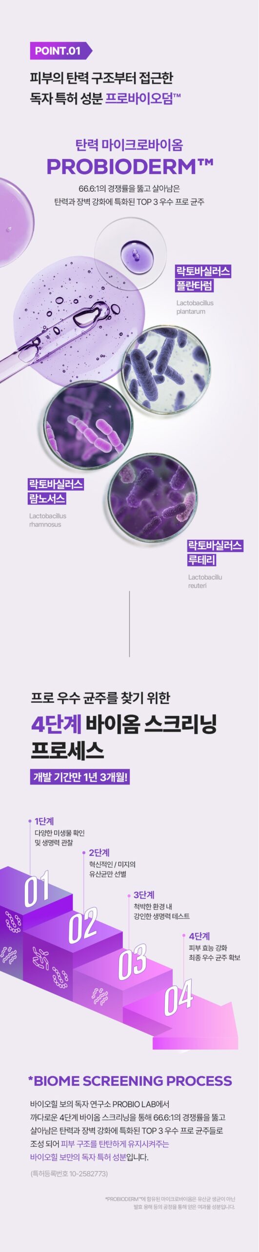 Das Herzstück dieser Formel ist der einzigartige, patentierte Probioderm™-Komplex, der ein Trio aus potenten probiotischen Stämmen enthält: Lactobacillus plantarum, Lactobacillus rhamnosus und Lactobacillus reuteri. Dieser Elastizität steigernde Komplex wurde durch den sorgfältigen 4-Stufen-Screening-Prozess von PROBIO LAB entwickelt und ist optimiert, um die Hautelastizität zu verbessern und die Hautbarriere zu stärken.