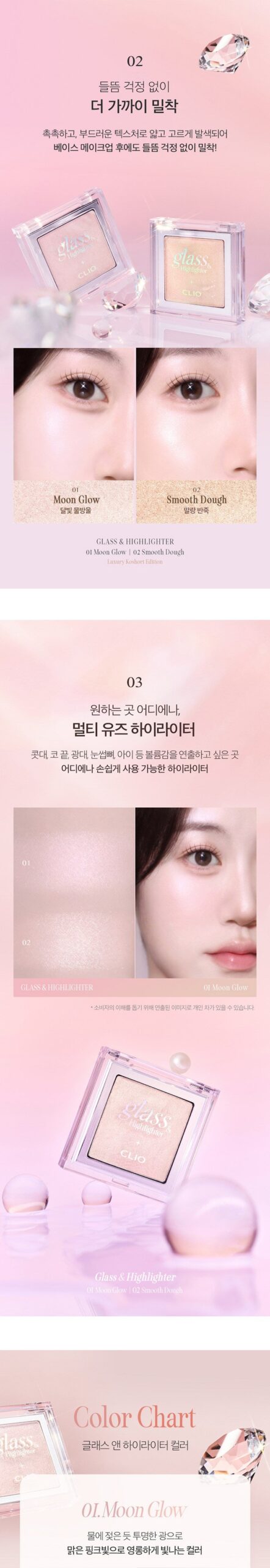- 01 Moon Glow: A delicate pink shade that glimmers with a transparent, water-like glow, perfect for a cool, ethereal finish.