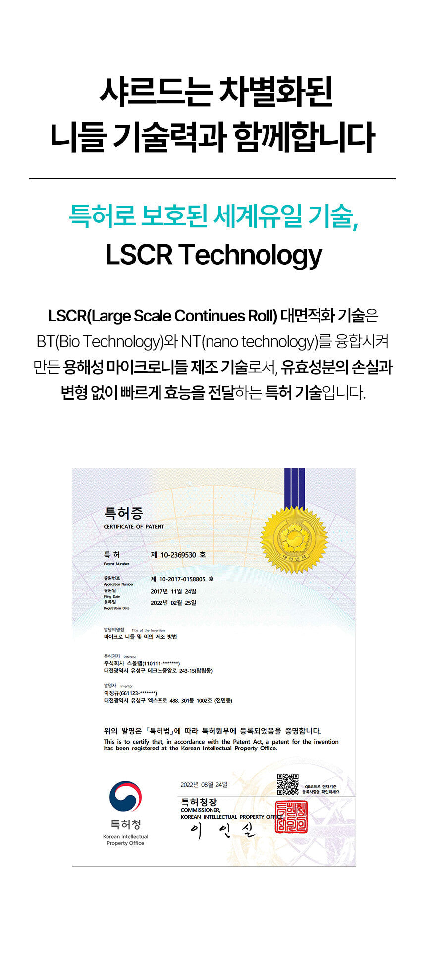 Our patented LSCR technology (Patent 10-2369530) ensures that active ingredients are delivered without loss or deformation, maximizing their effects.