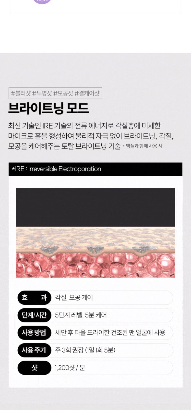 Brighten and rejuvenate your skin with IRE technology, which gently exfoliates and improves pores without physical irritation. This mode is perfect for those looking to enhance skin clarity and smoothness.