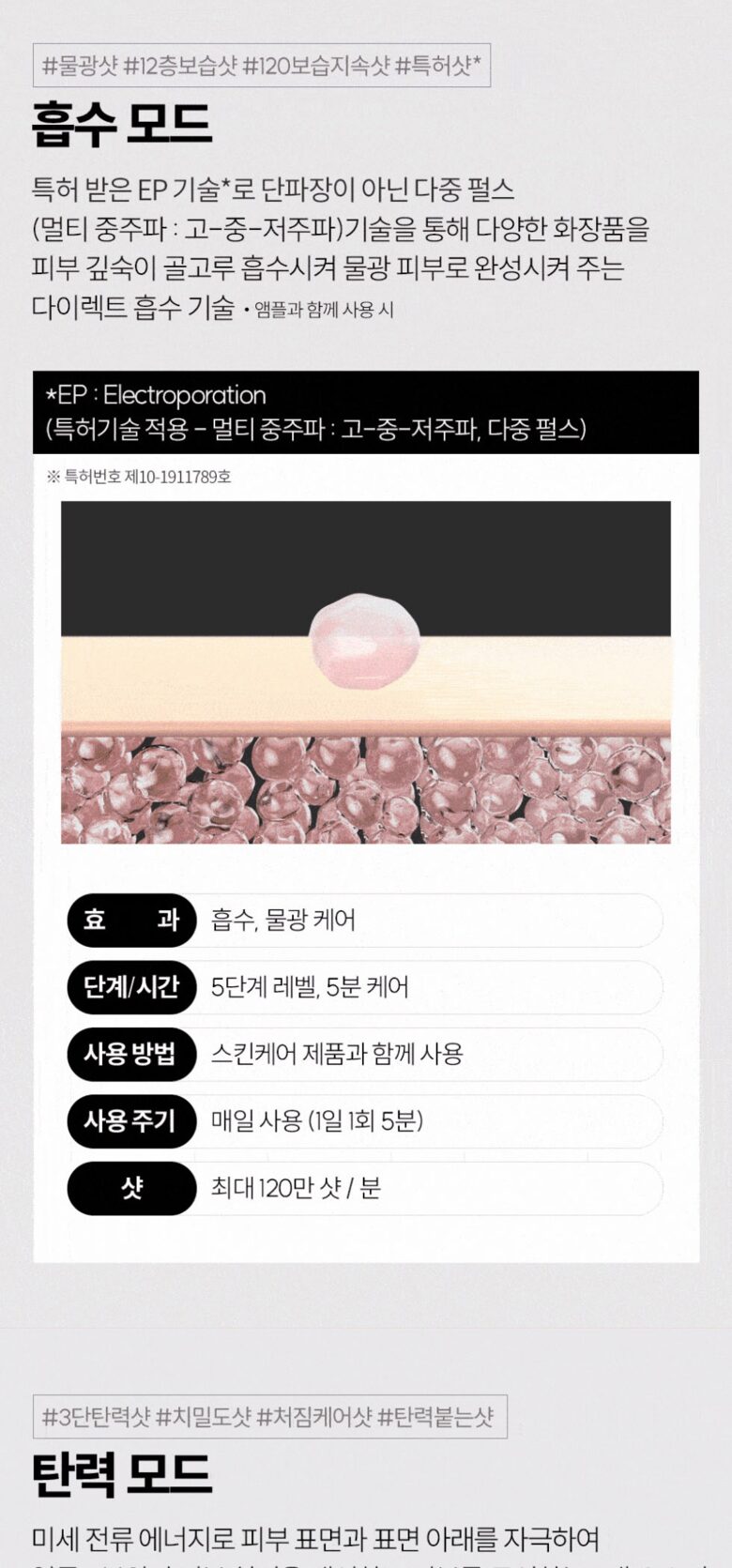Maximize the absorption of your skincare products with patented EP technology. This mode ensures that products penetrate deeply into the skin, leaving it radiant and hydrated.