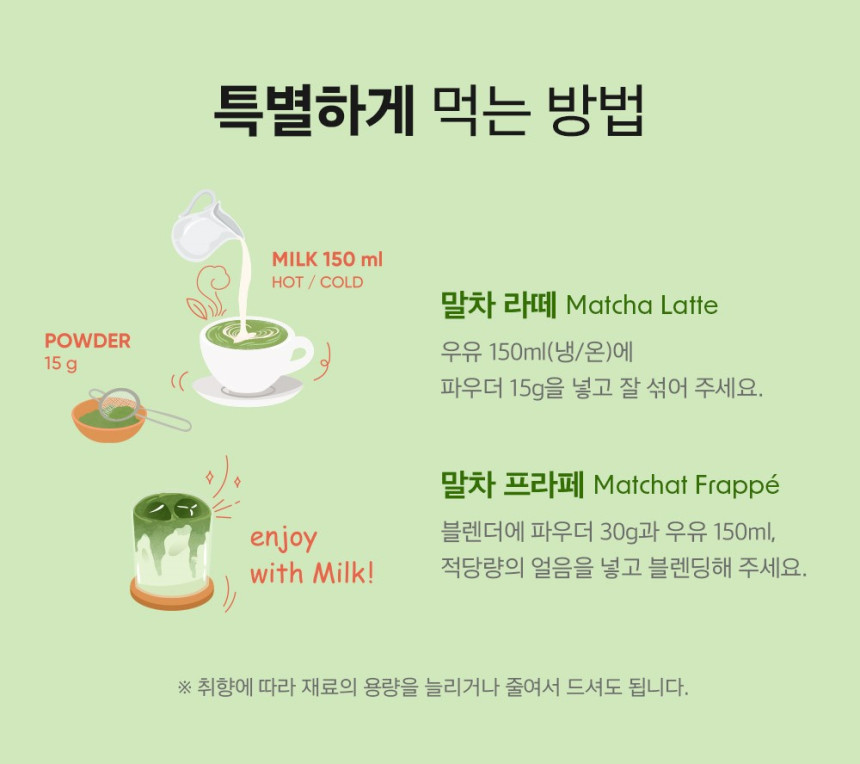 - Matcha Latte: Mix 1-2 teaspoons with hot water, add steamed milk and sweetener to taste