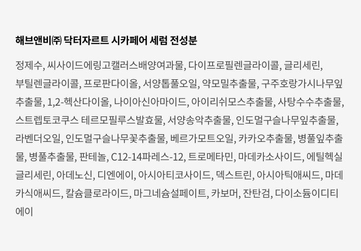 精製水、シーサイドリンゴカルス培養ろ液、ジプロピレングリコール、グリセリン、ブチレングリコール、プロパンジオール、ヤローオイル、薬用小麦エキス、グジュホーリーリーフエキス、1,2-ヘキサンジオール、ナイアシンアミド、アイリッシュモスエキス、サトウキビエキス、ストレプトコッカスサーモフィルス発酵製品、西洋松エキス、インドマルベリーリーフエキス、ラベンダーオイル、インドマルベリーフラワーエキス、ベルガモットオイル、カカオエキス、ツボクサリーフエキス、ツボクサエキス、パンテノール、C12-14パレス-12、トロメタミン、マデカッソシド、エチルヘキシルグリセリン、アデノシン、DNA、アジアチコシド、デキストリン、アジアチック酸、マデカシン酸、塩化カルシウム、硫酸マグネシウム、カルボマー、キサンタンガム、EDTA二ナトリウム