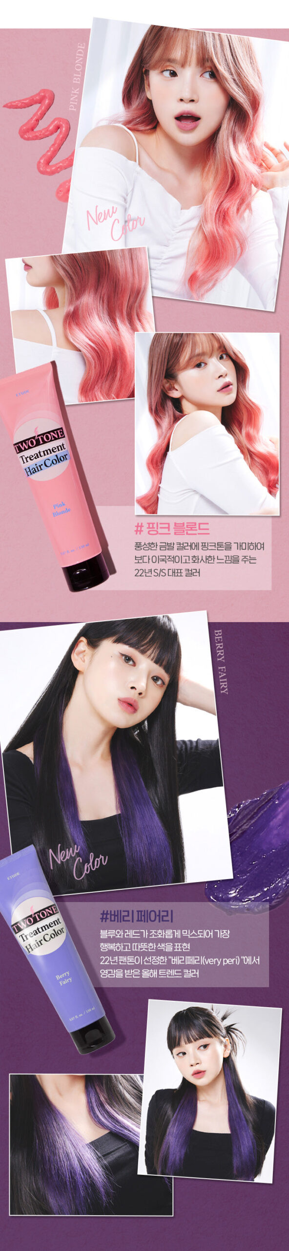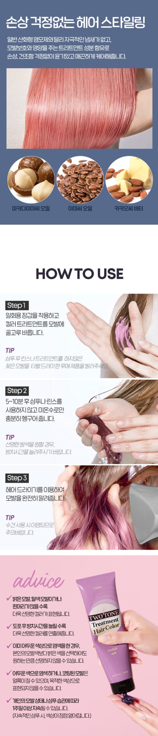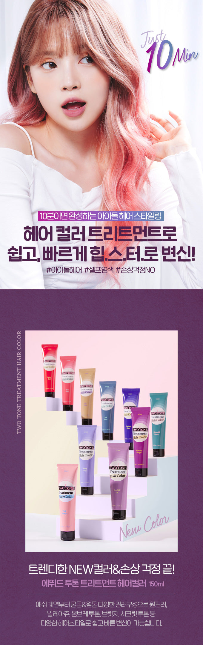 I recently tried the ETUDE Two-Tone Treatment Hair Color and was pleasantly surprised by the results. The vivid colors were achieved in just 10 minutes, making it incredibly convenient. I appreciated that it contains macadamia seed oil and cacao seed butter, which helped keep my hair nourished while coloring. Unlike traditional dyes, there was no irritating smell at all—just a pleasant experience! My hair looked shiny and felt smooth after treatment, with no dryness whatsoever. This product truly provides a unique way to add color without damaging your locks.