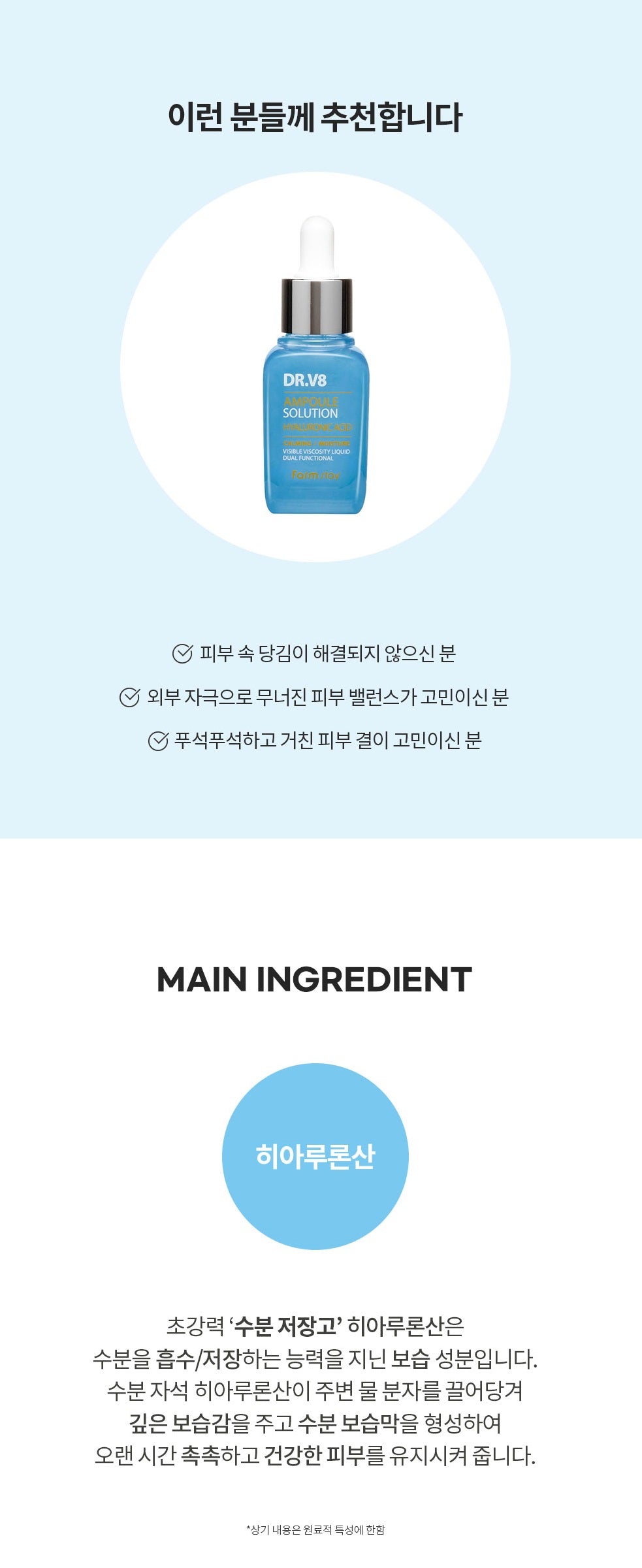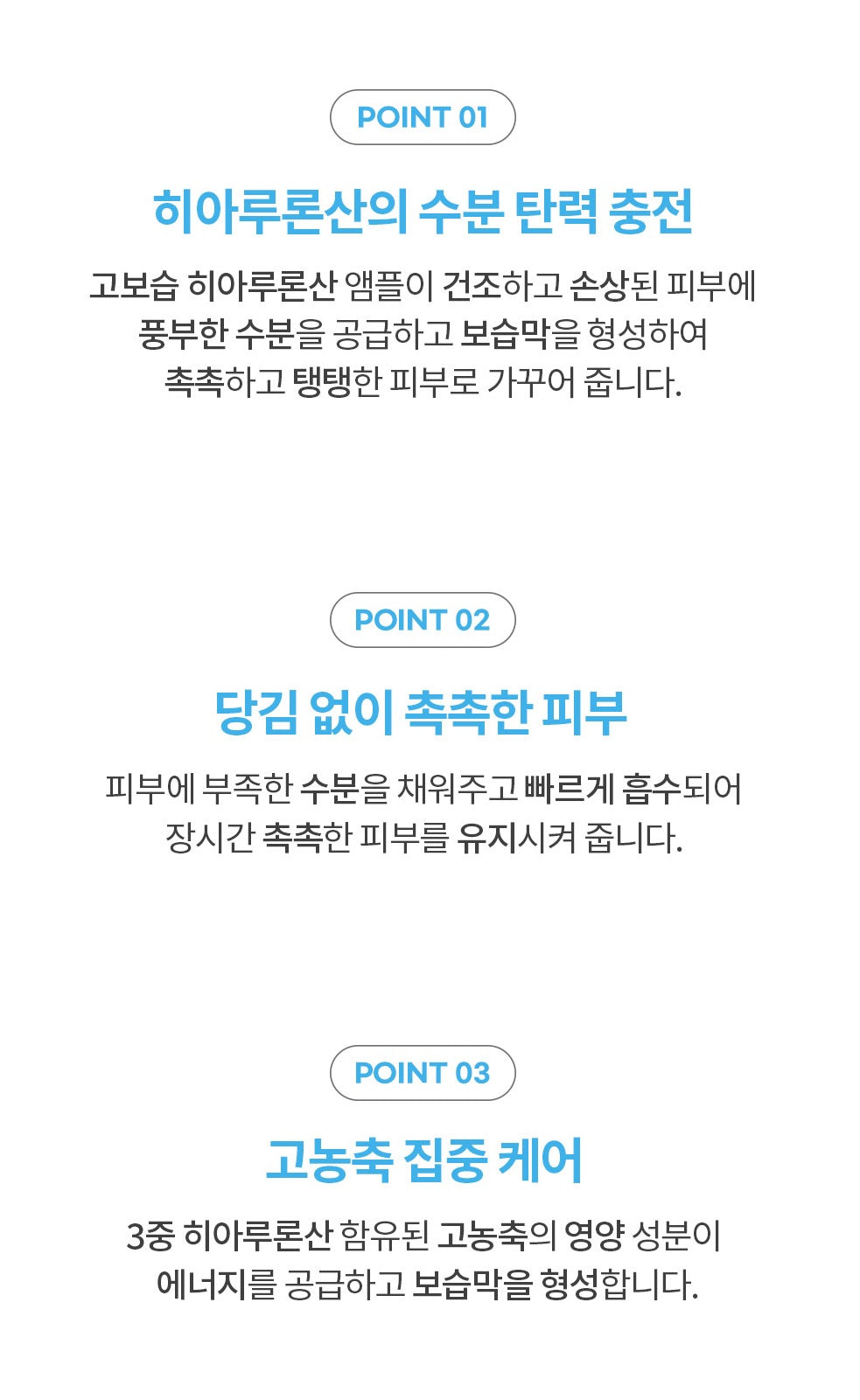 高保湿ヒアルロン酸アンプルが乾燥して傷んだ肌に豊かな水分を供給し、保湿膜を形成して肌をしっとり弾力的にします。