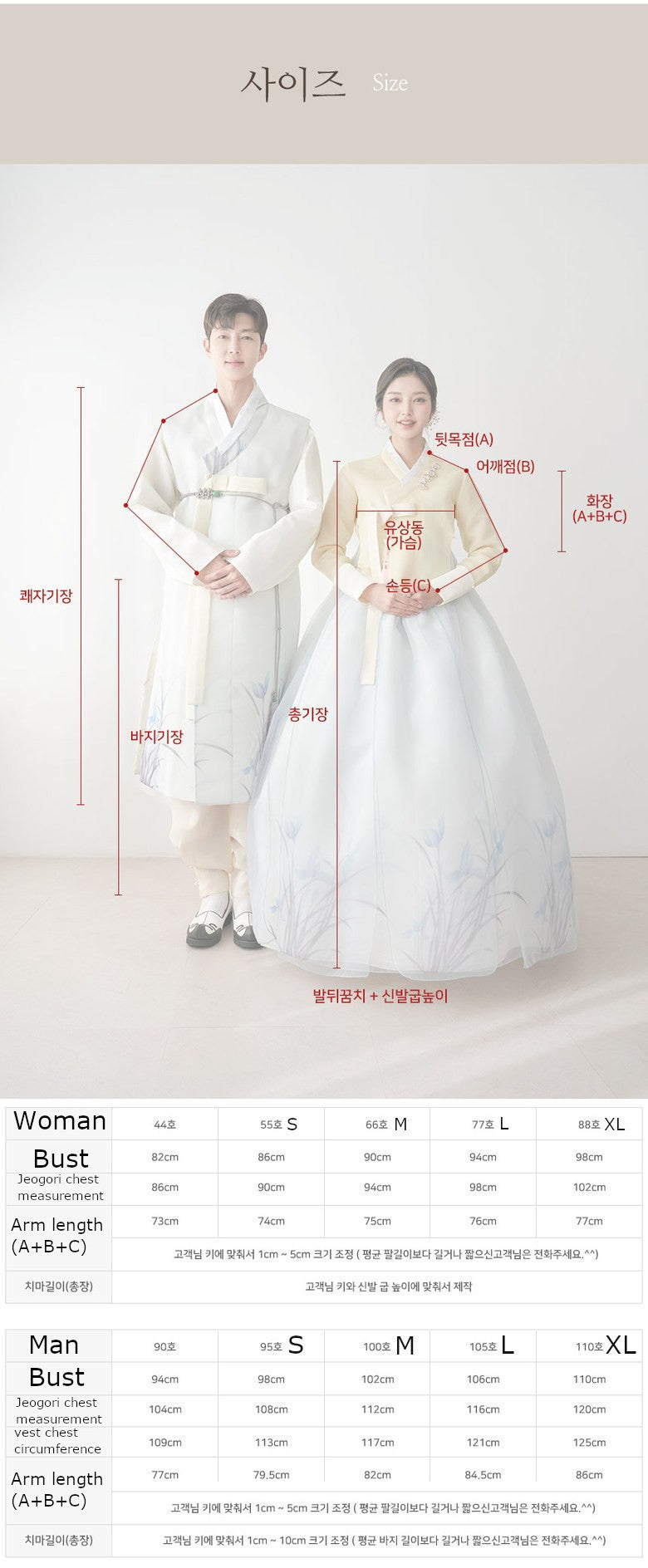 Each hanbok is custom-made to fit your body shape, including the skirt and sleeve length. Since each product is custom-made, size exchanges or returns are not possible. Please refer to the size chart before ordering.
