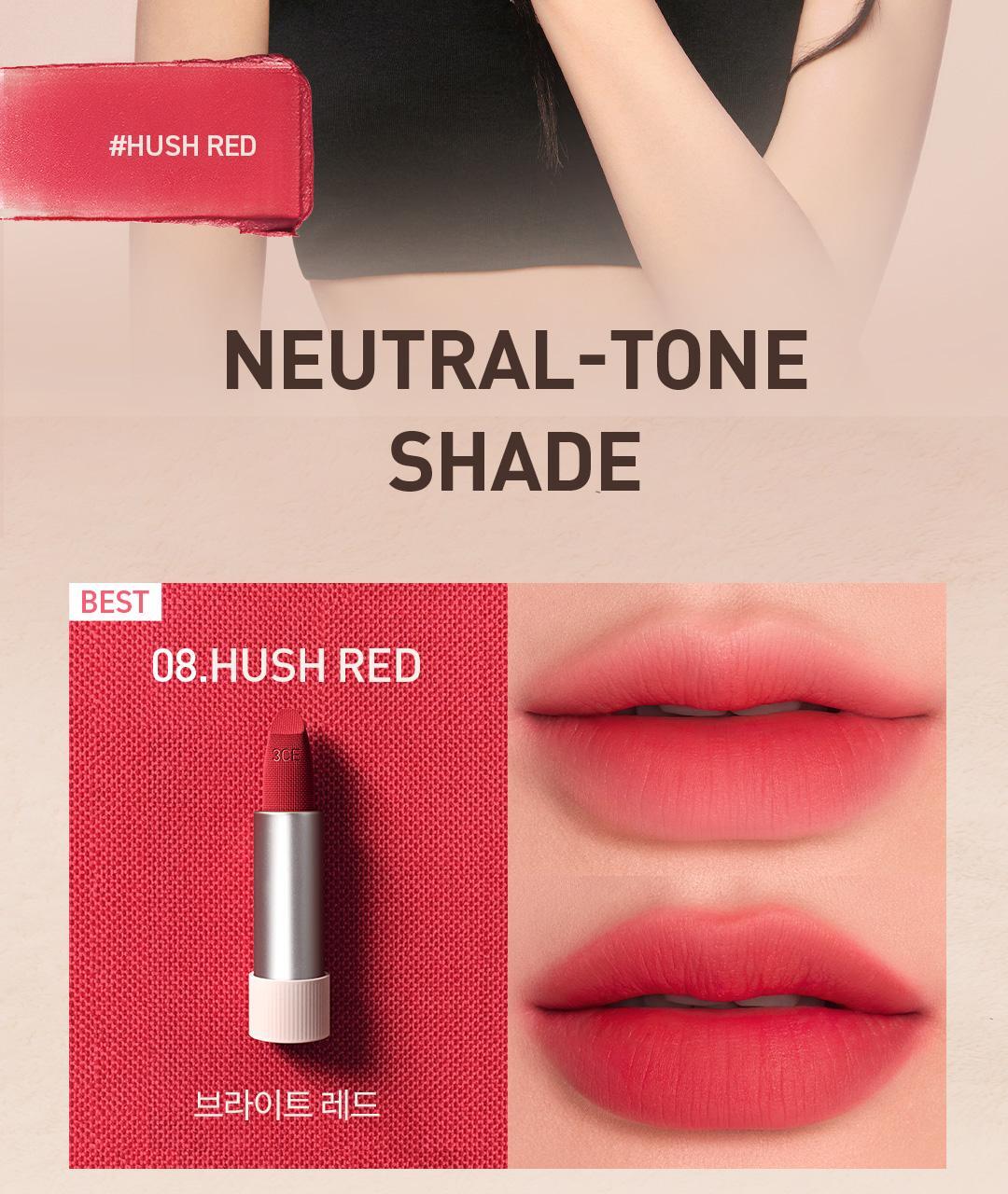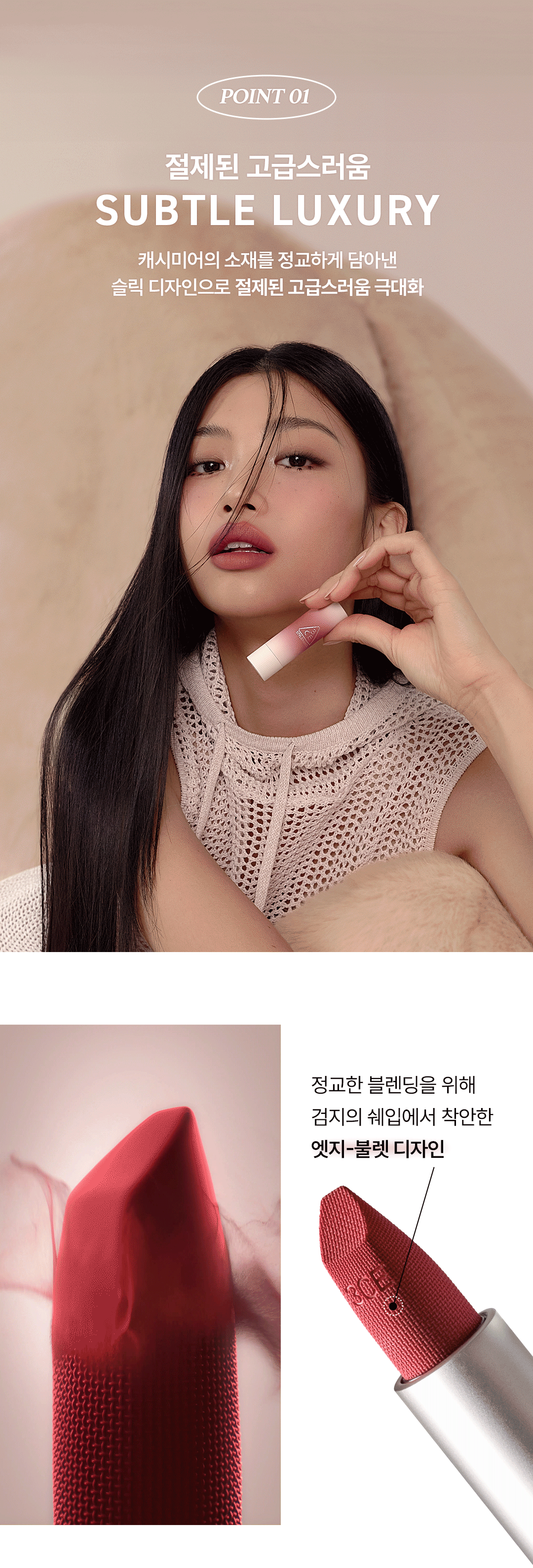 The 3CE Cashmere Hug Lipstick features a sleek, modern design inspired by the soft, delicate texture of cashmere. Its brush-tip applicator, designed to mimic the shape of a fingertip, allows for precise and effortless blending, delivering a flawless lip look.