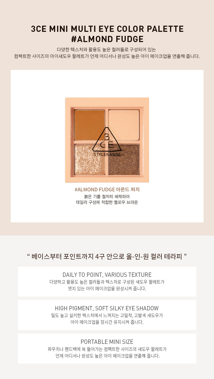 I recently tried the 3CE Mini Multi Eye Color Palette in Almond Fudge, and I must say, it exceeded my expectations. The range of yellow-brown shades is perfect for achieving a natural look that avoids any redness around my eyes. What I really appreciate is the high-pigment formula; just a small amount delivers vibrant color without needing multiple layers. The silky texture makes application seamless, and these shadows last all day long without creasing! Plus, its compact size fits perfectly in my purse for touch-ups on-the-go. This palette has quickly become an essential part of my daily makeup routine.