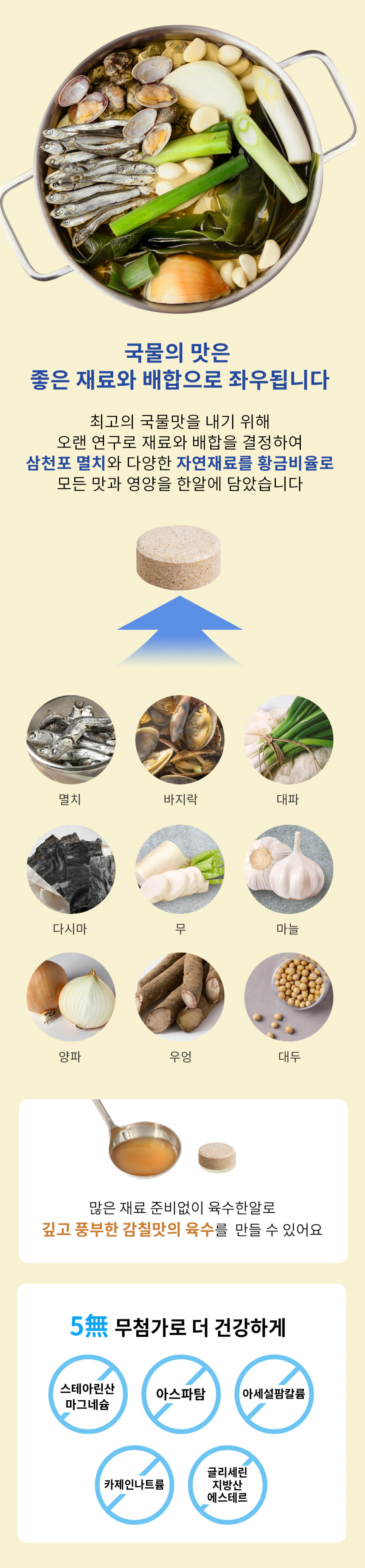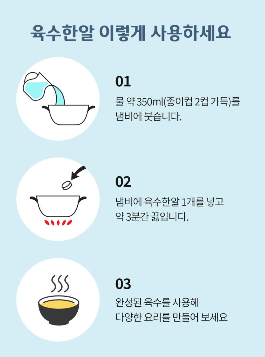 It is a must-have in our kitchen, where a deep and rich broth is brewed in just 3 minutes by simply adding fondant to water. Samcheonpo Anchovies, seafood, and vegetables are prepared in a golden balance to create the best soup flavor that harmonizes the flavors of each ingredient.