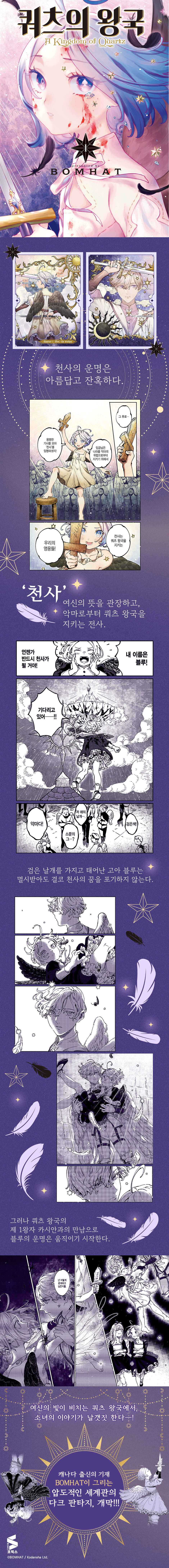So I just dove into ‘A Kingdom of Quartz,’ and wow, what a wild ride! It totally messes with your heart strings. Imagine this girl Blue—her vibe is super relatable even if she has those dark wings that make her stand out like no one else in the city! Like, every page made me feel all kinds of things about dreams and belonging, ya know? Then there’s this charming prince who flips everything upside down for her (classic!). It’s really nice to see strong themes mixed with gorgeous art from Korea—you’re gonna want to keep it on display forever! Honestly can’t wait for Volume 2!