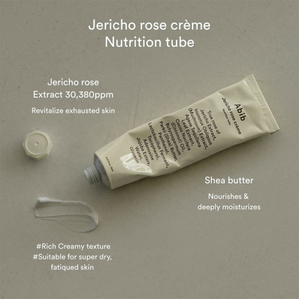 The Abib Jericho rose crème Nutrition tube is a deeply nourishing cream to replenish dry skin with long-lasting moisture. Infused with 30,380ppm of Jericho Rose Extract, it penetrates deep into skin, delivering hydration and nourishment to skin’s inner layers. Also contains Chaga Mushroom Extract to recharge dull skin with nutrition and enhance skin barrier, while Blue Agave Extract restores water and oil balance. This moisturiser has a rich, creamy texture for long-lasting moisture and nourishment without leaving a sticky or greasy residue. Recommended for babes with dry, fatigued skin!