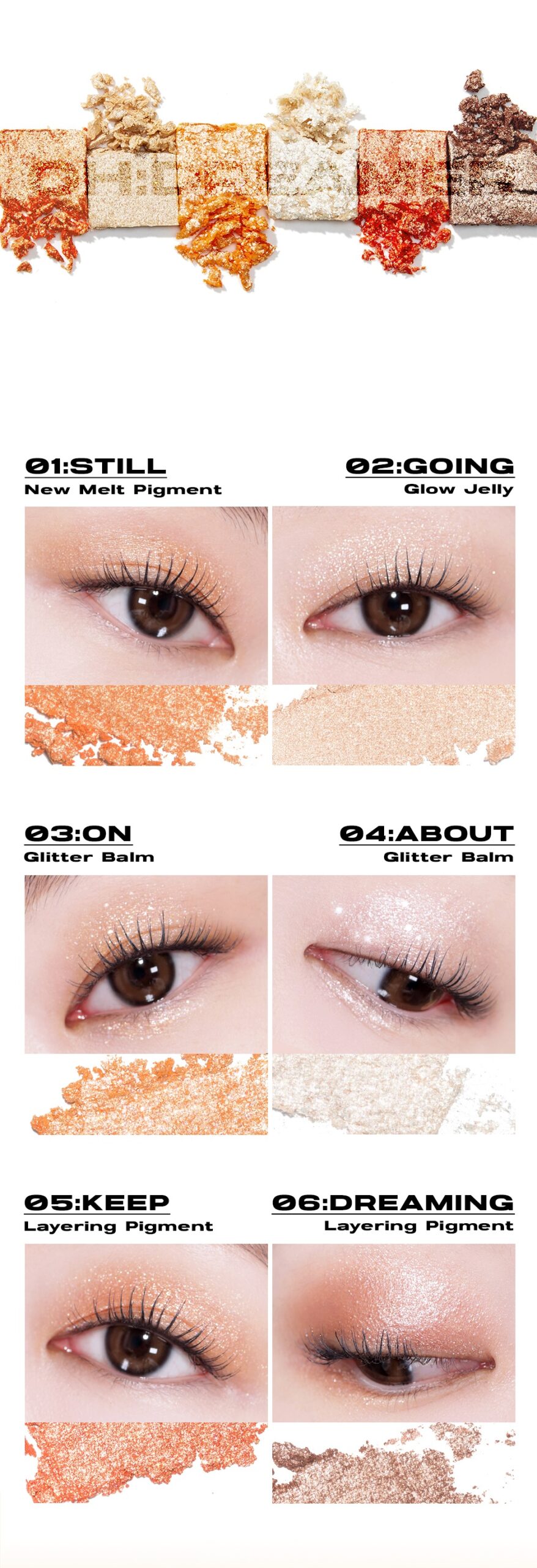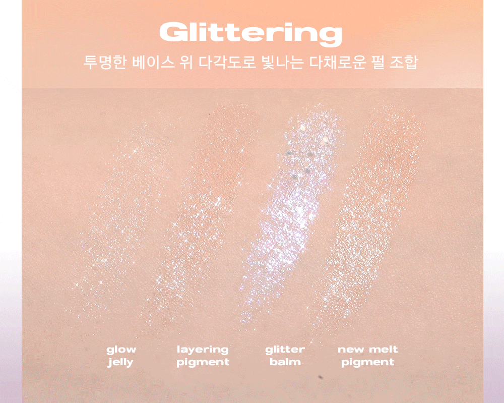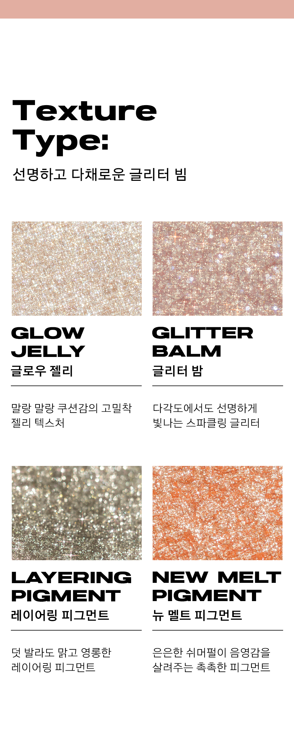 - Glow Jelly: A high-adhesion jelly texture that provides a soft, cushiony feel. The transparent base, infused with multi-dimensional pearls, creates a radiant shimmer that catches the light from all angles.