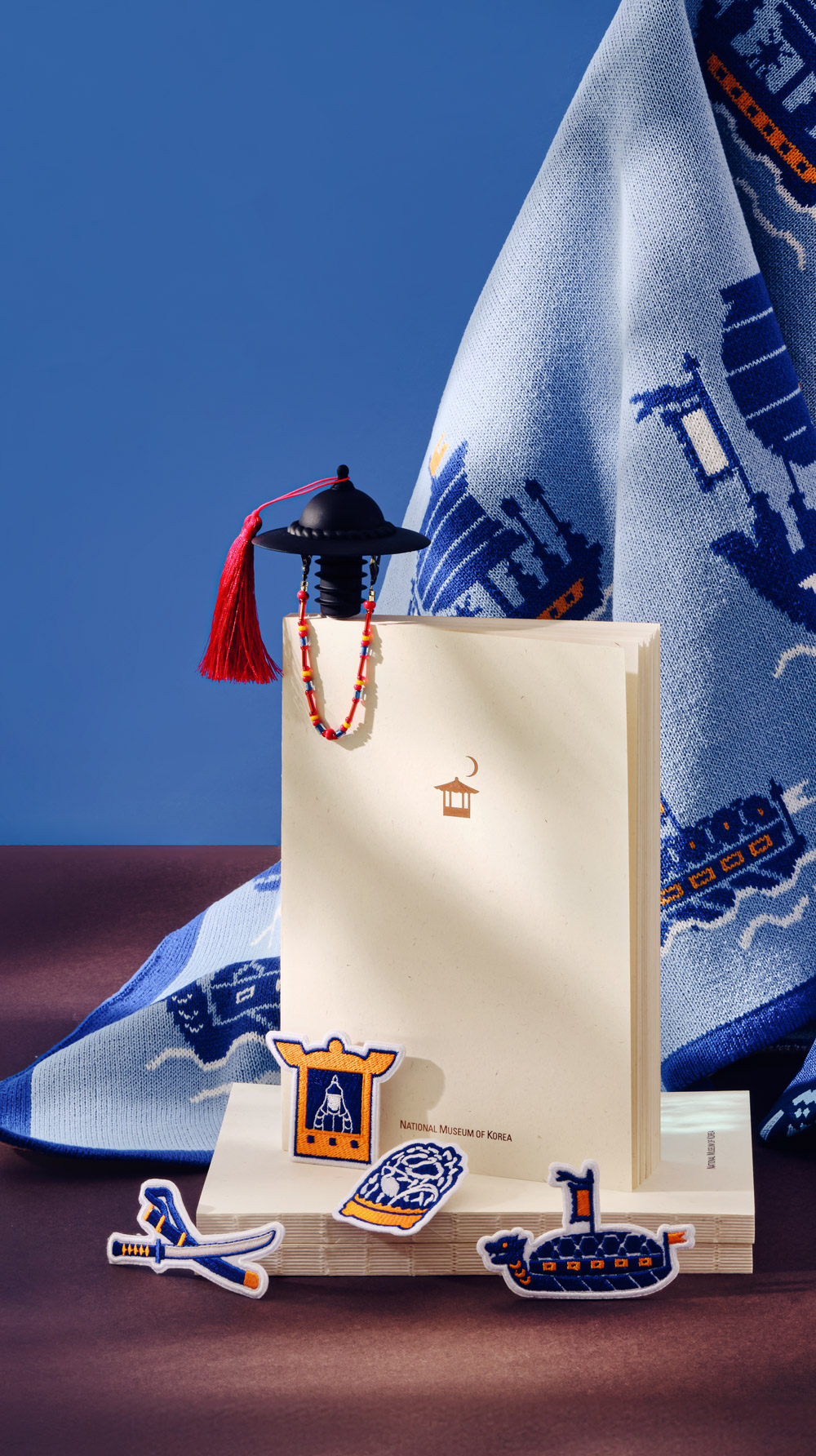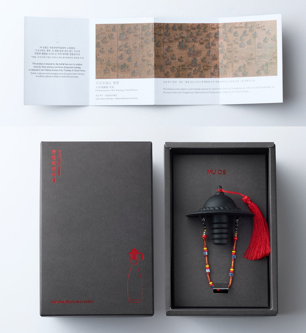 The design is inspired by the Jeonrip (전립) – a traditional Joseon dynasty military hat worn by naval officers during combined training, as depicted in the museum collection “Naval Training Folding Screen (수군조련도 병풍).”