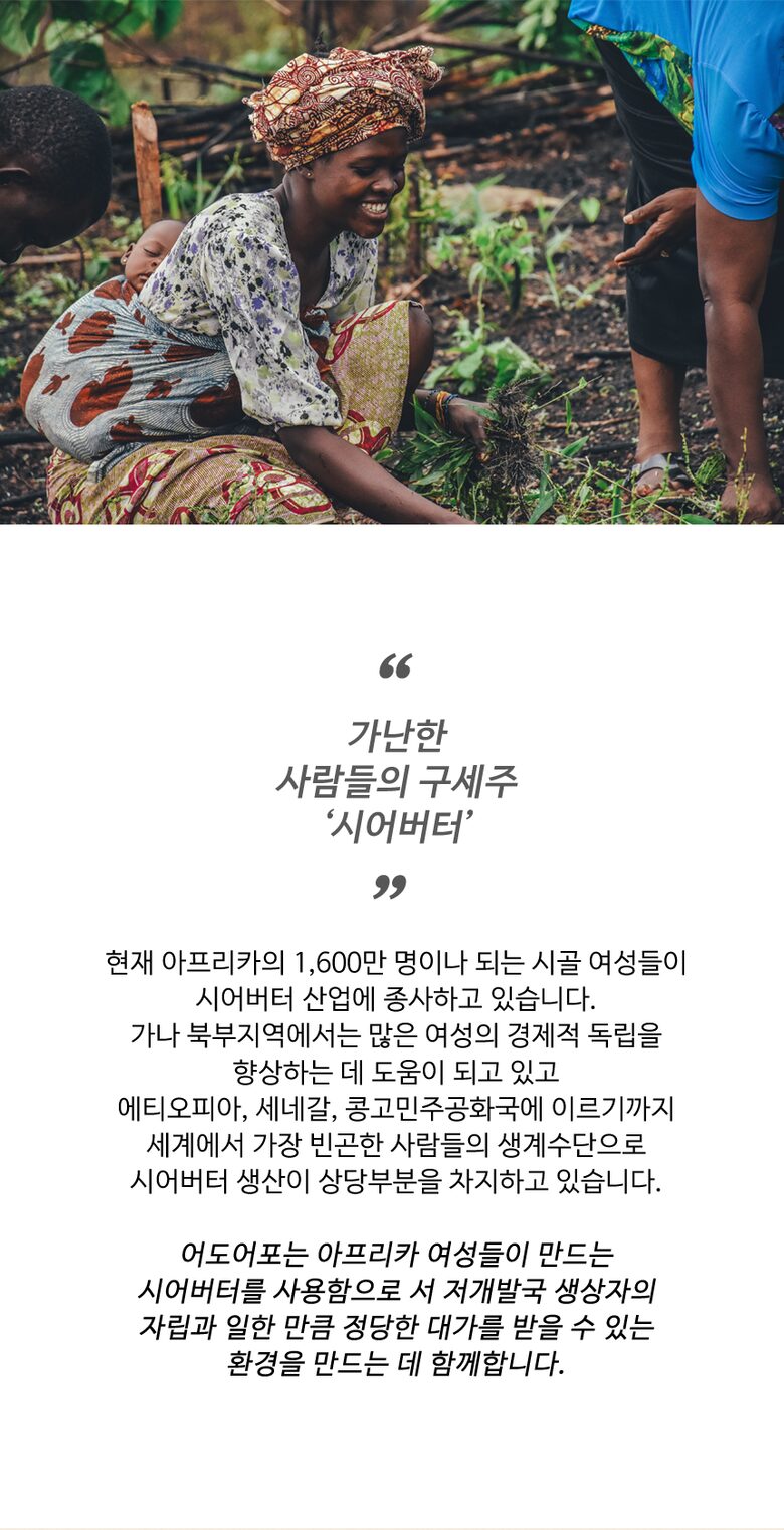 - Shea Butter: Sourced from African women, supporting economic independence for approximately 16 million rural women involved in the shea butter industry across countries like Ghana, Ethiopia, Senegal, and the Democratic Republic of Congo. adore4 is committed to fair trade practices, helping to create a sustainable environment for these producers to earn a fair wage.