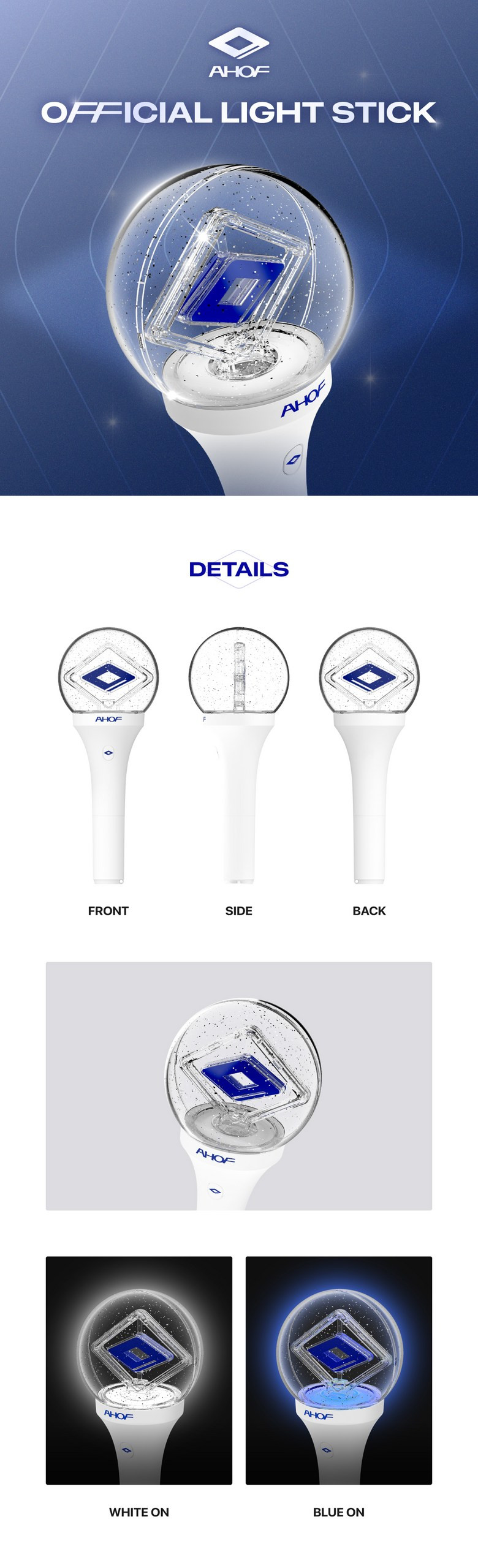 - Iconic Visuals: The light stick features a stunning clear dome filled with sparkling glitter, encapsulating a striking blue diamond-shaped emblem. This unique design perfectly captures AHOF’s distinct identity.