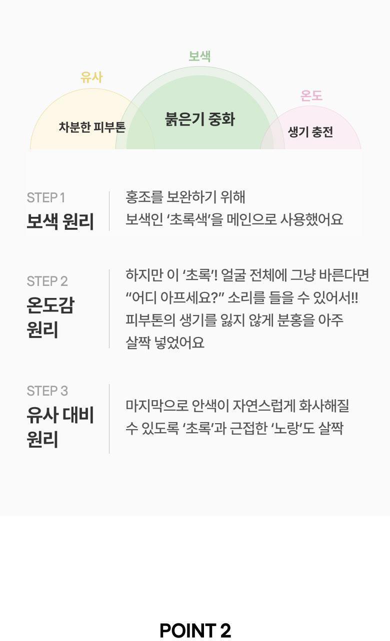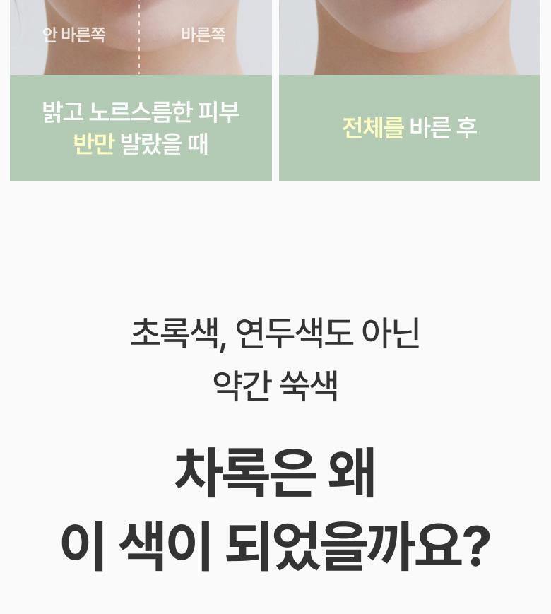 To neutralize redness, the cushion uses green as the primary color, which works as a complementary shade. -