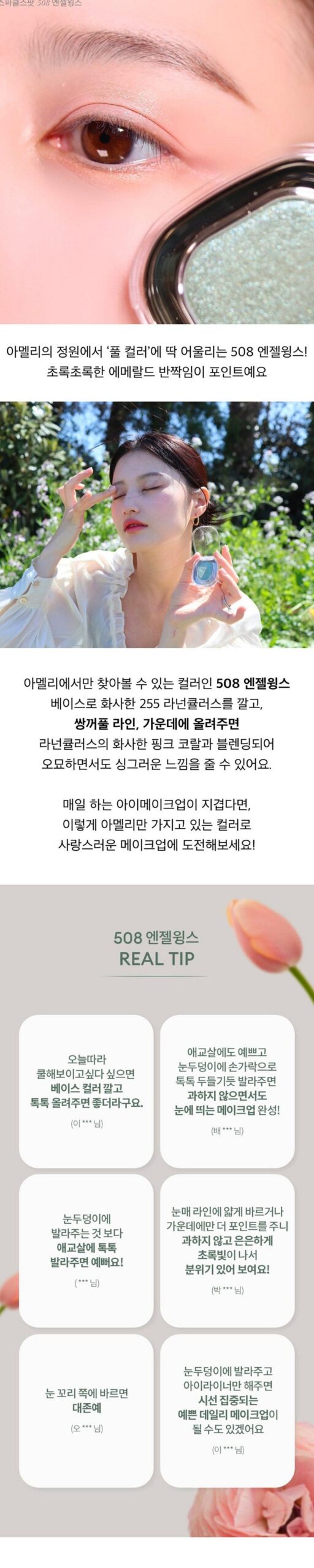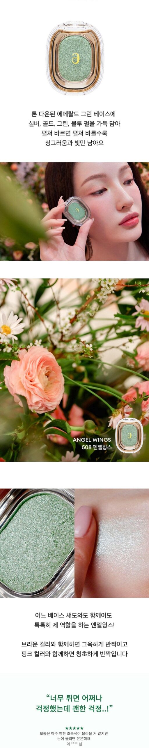 I was really impressed with the Ameli Sparkle Spot 508 Angel Wings shimmer. The aqua-colored sparkle is absolutely stunning and reflects light beautifully, creating a multidimensional effect on my skin. I love how it contains large-particle glitter but glides on smoothly without feeling sticky, thanks to the Soft Feel Texture system. It’s lightweight yet gives a dramatic look that lasts all day; perfect for special occasions or even just adding some glam to an everyday outfit!