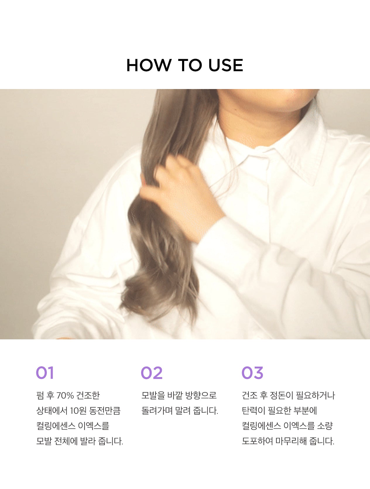 - After towel drying or blow-drying your hair to 70% dryness, apply a dime-sized amount of Curling Essence 2X evenly throughout your hair.
