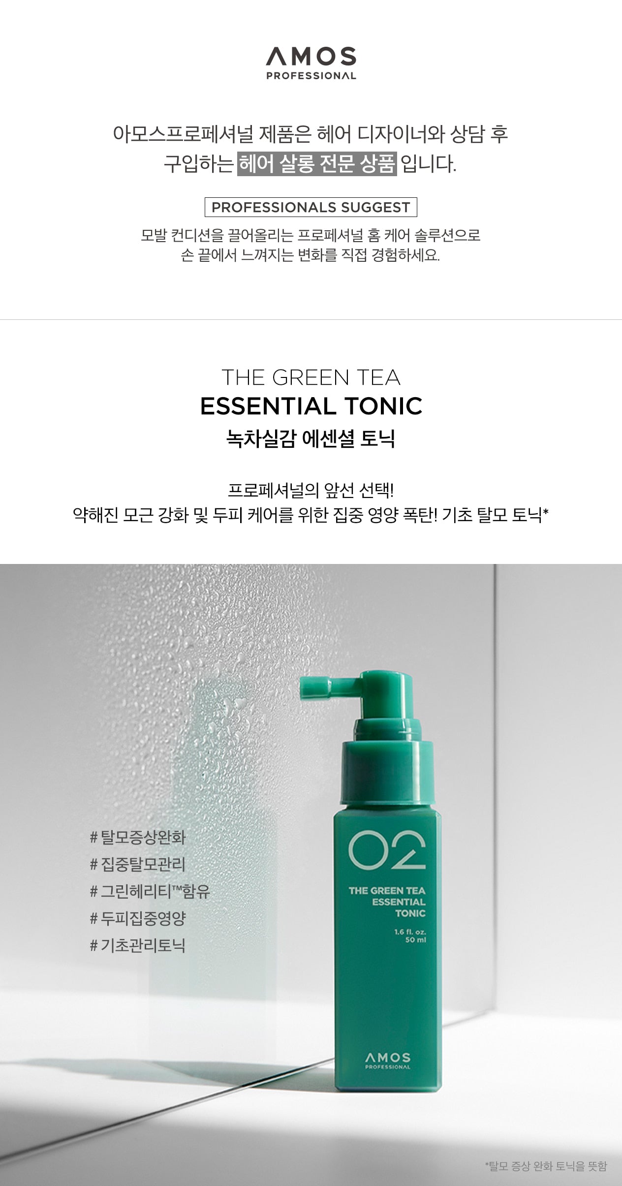 Revitalize your scalp and strengthen hair roots with Amos Green Tea Essential Tonic, designed to alleviate hair loss symptoms caused by stress.