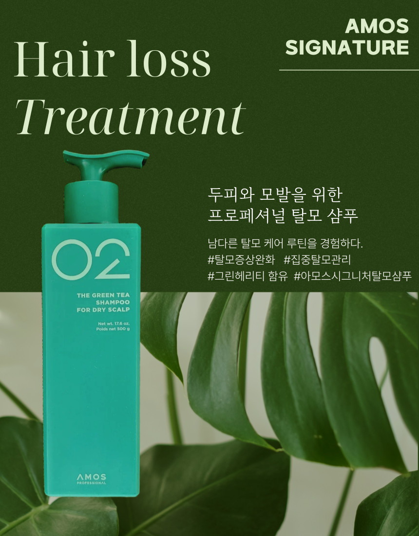Amos Green Tea Shampoo for Dry Scalp 500g is a professional-grade scalp care shampoo that has been ranked #1 in hair loss relief for 5 consecutive years in Korea. Formulated with premium shade-grown green tea containing 3x more amino acids, this shampoo gently cleanses while providing moisture and nourishment to normal-dry scalps.