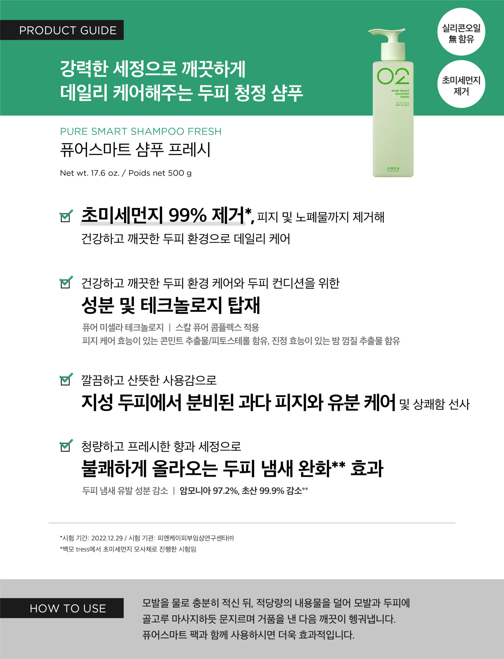 Experience the ultimate scalp care with Amos Pure Smart Shampoo Fresh, designed for daily cleansing to remove fine dust, excess sebum, and impurities. This refreshing shampoo is your go-to solution for maintaining a clean, healthy scalp every day.