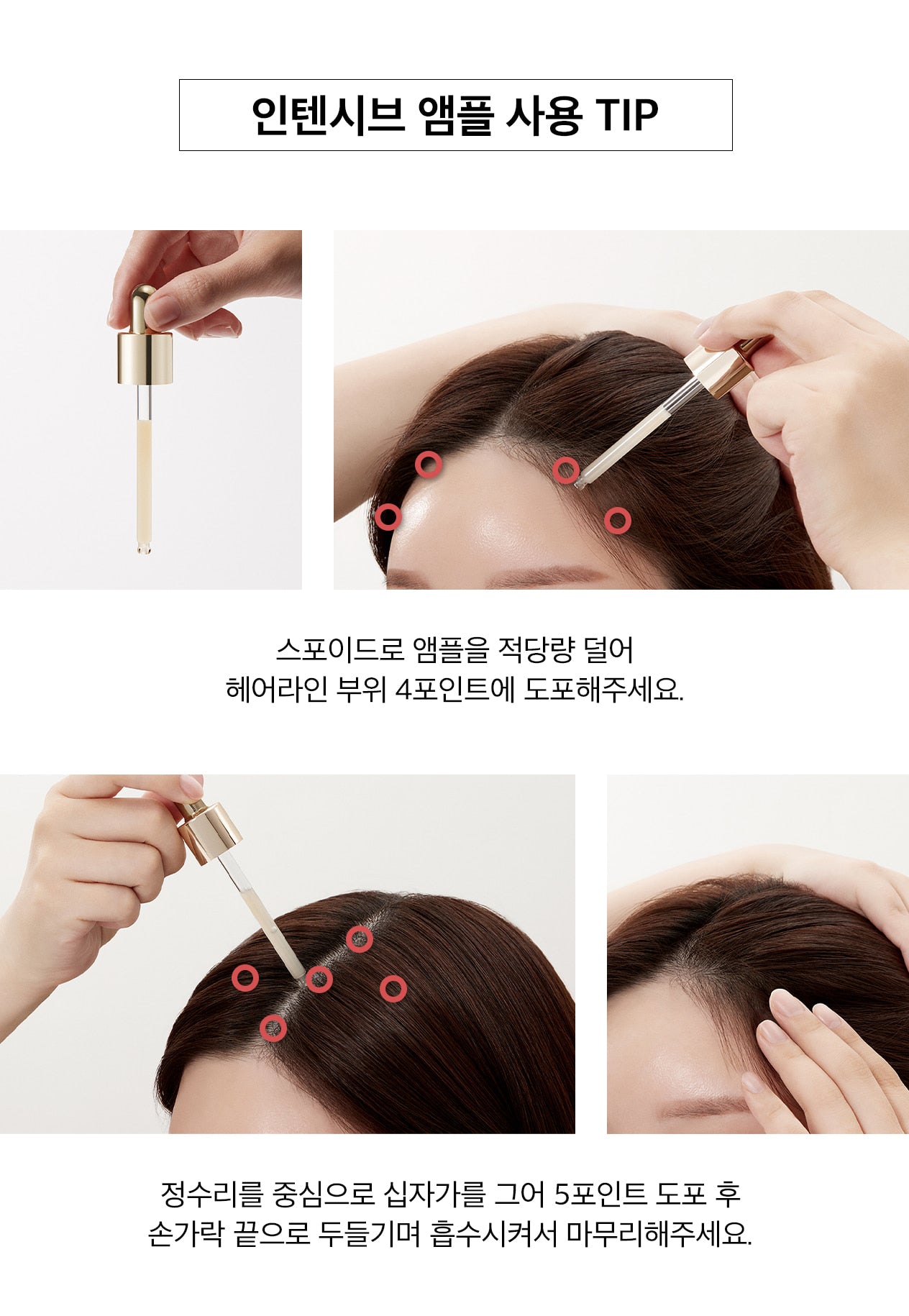 1️⃣ Use the dropper to apply a small amount of ampoule to four key points along your hairline.
