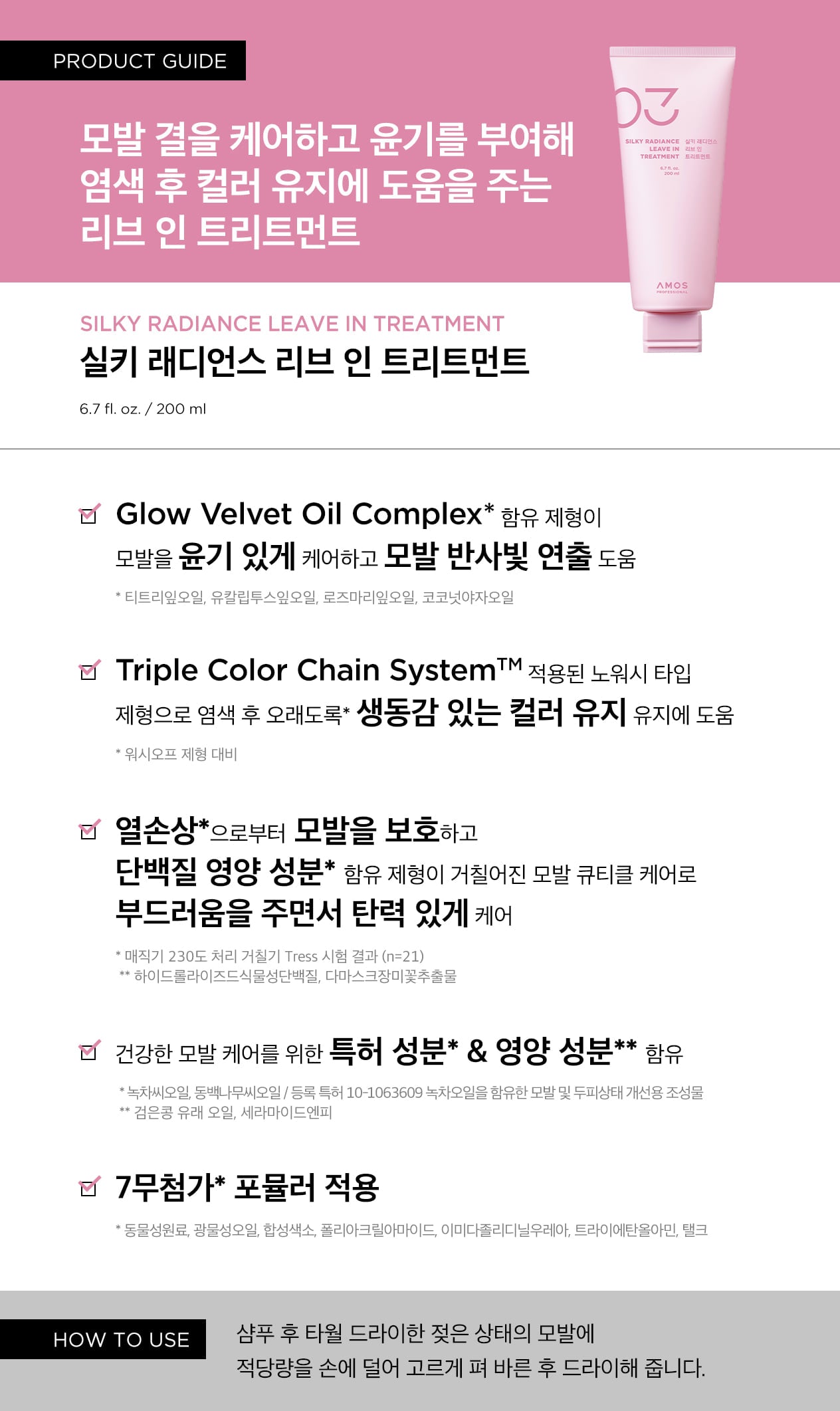 Nourish and protect your hair with Amos Silky Radiance Leave-In Treatment, a no-rinse formula that smooths rough hair texture, enhances shine, and helps maintain vibrant hair color after dyeing. Infused with a blend of botanical oils, this treatment also shields hair from heat damage while restoring elasticity and moisture.