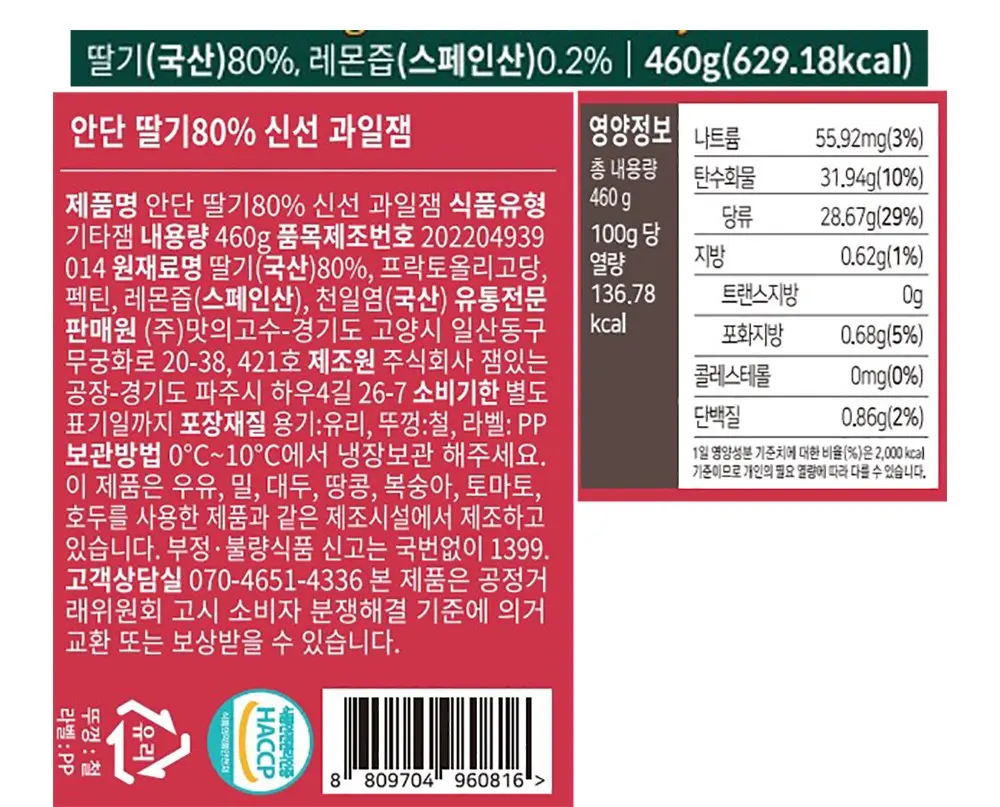 - Ingredients: Strawberry (domestic) 80%, fructo-oligosaccharide, pectin, lemon juice (Spanish), sea salt (domestic)