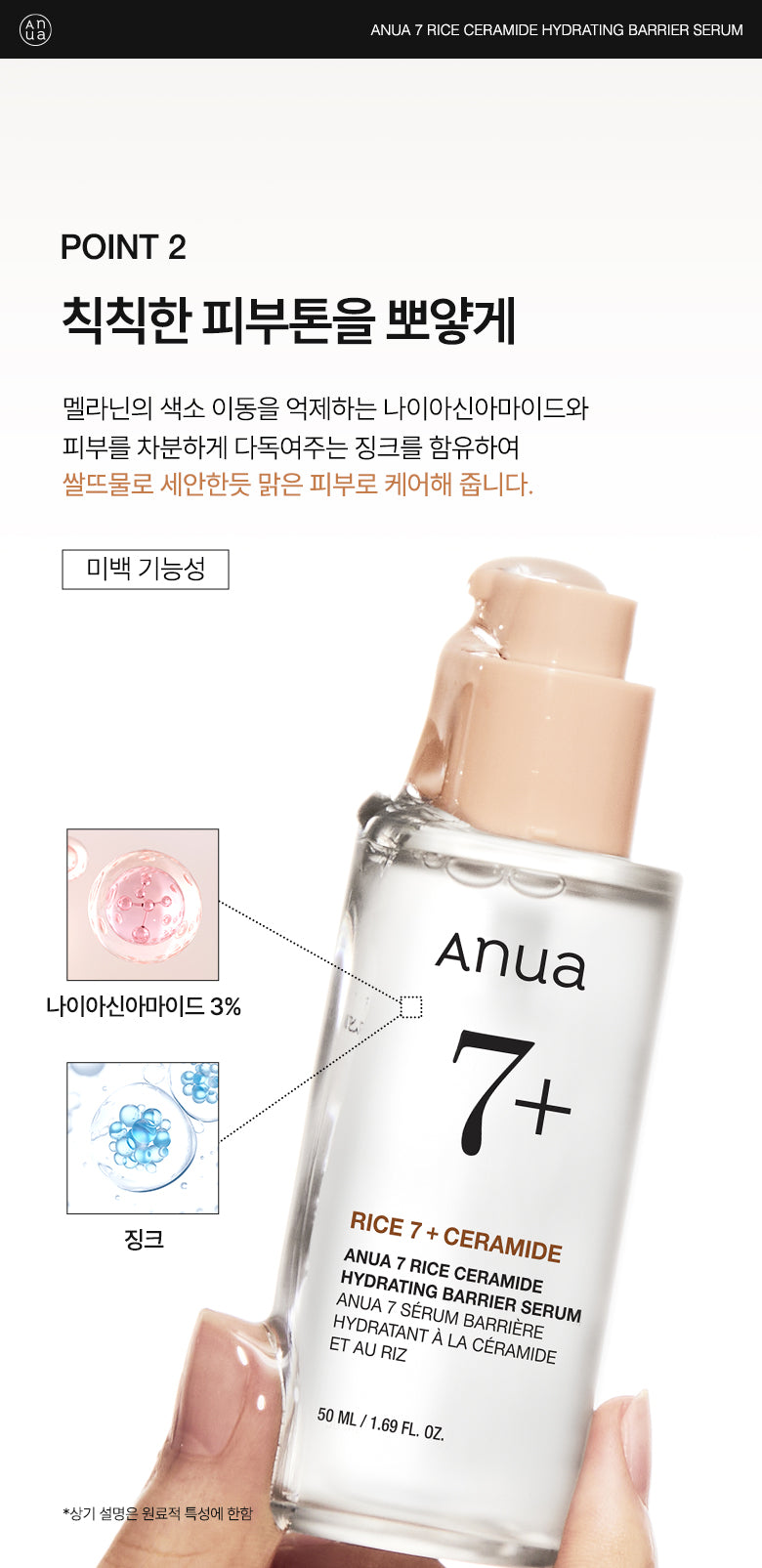 This serum is infused with 7 rice-derived ingredients and a Ceramide Complex (ANUA RICERA™) to improve weakened skin barriers, leaving your skin clearer, healthier, and more radiant. The ANUA RICERA™ complex contains not only rice protein but also rice-derived vitamins, minerals, and dietary fibers, delivering intense nourishment and vitality to your skin.