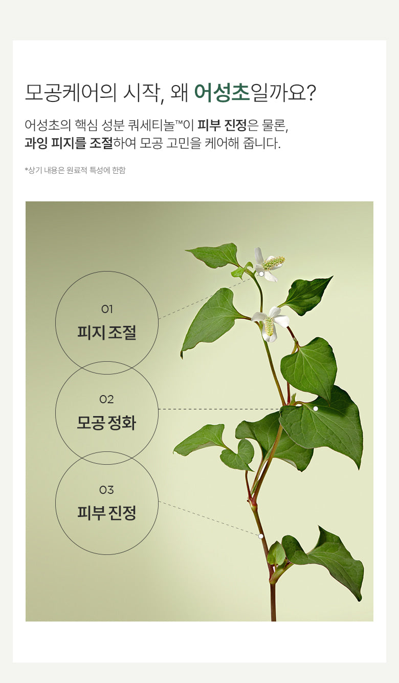 Quercetinol™, a key ingredient of heartleaf, not only soothes the skin, but also controls excess sebum to take care of pore problems.