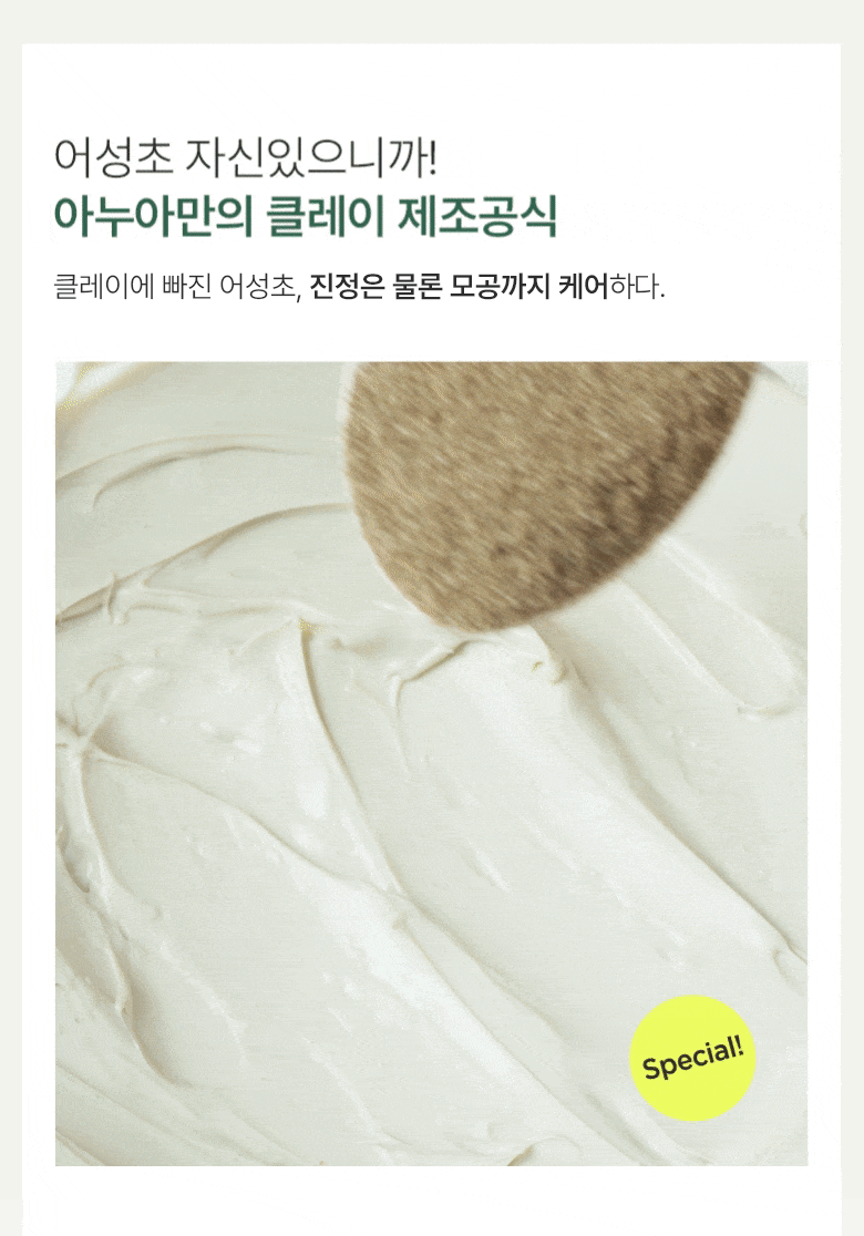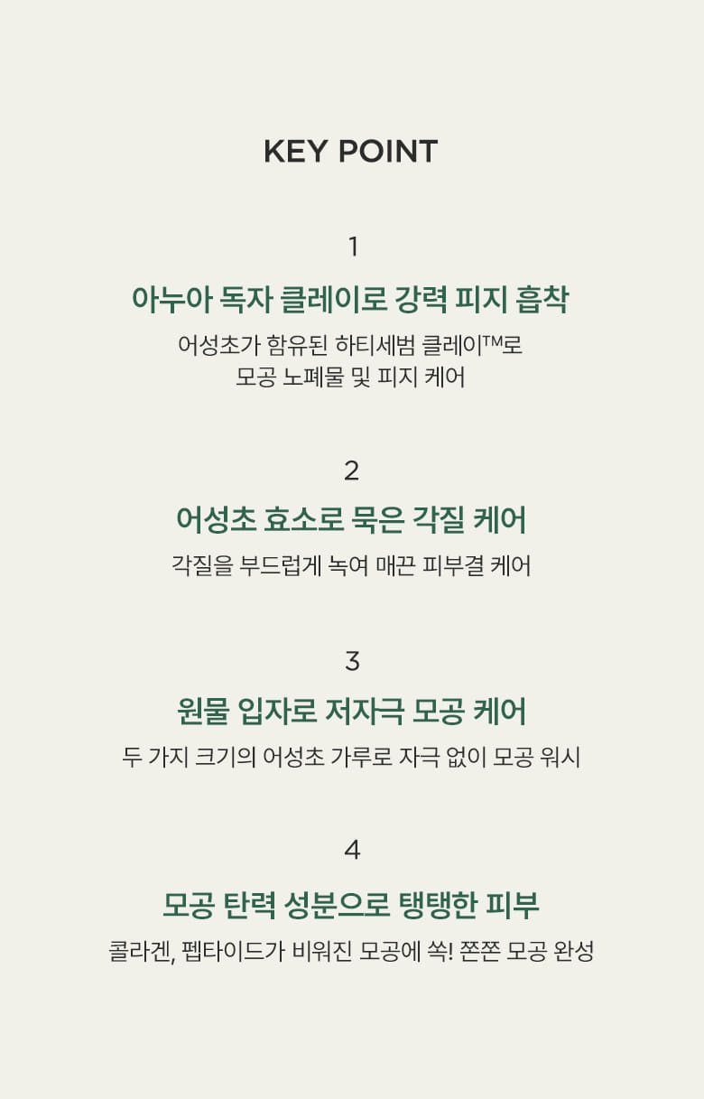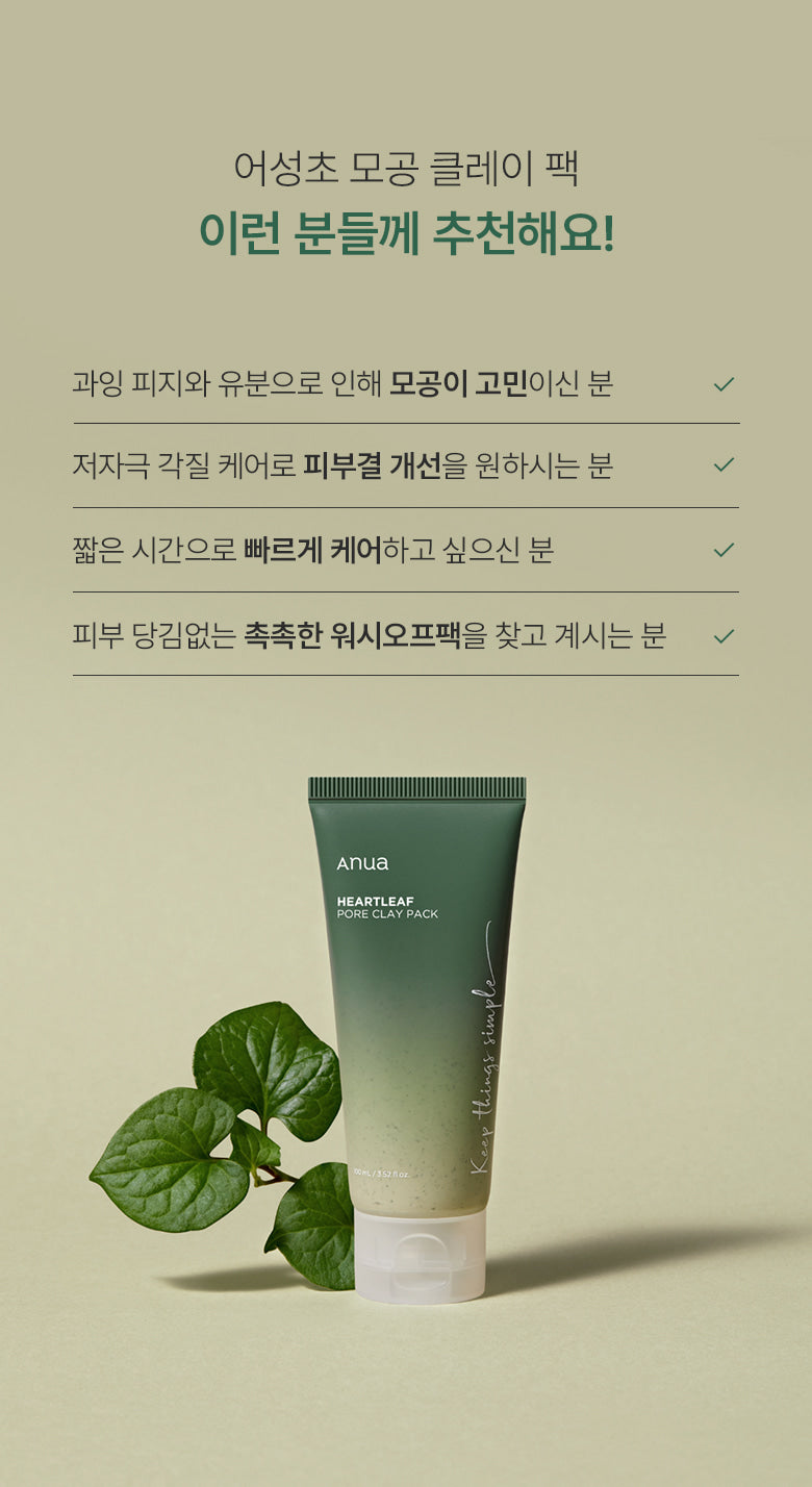 Clay containing heartleaf gently removes sebum and waste accumulated in pores by adsorbing them to every corner.