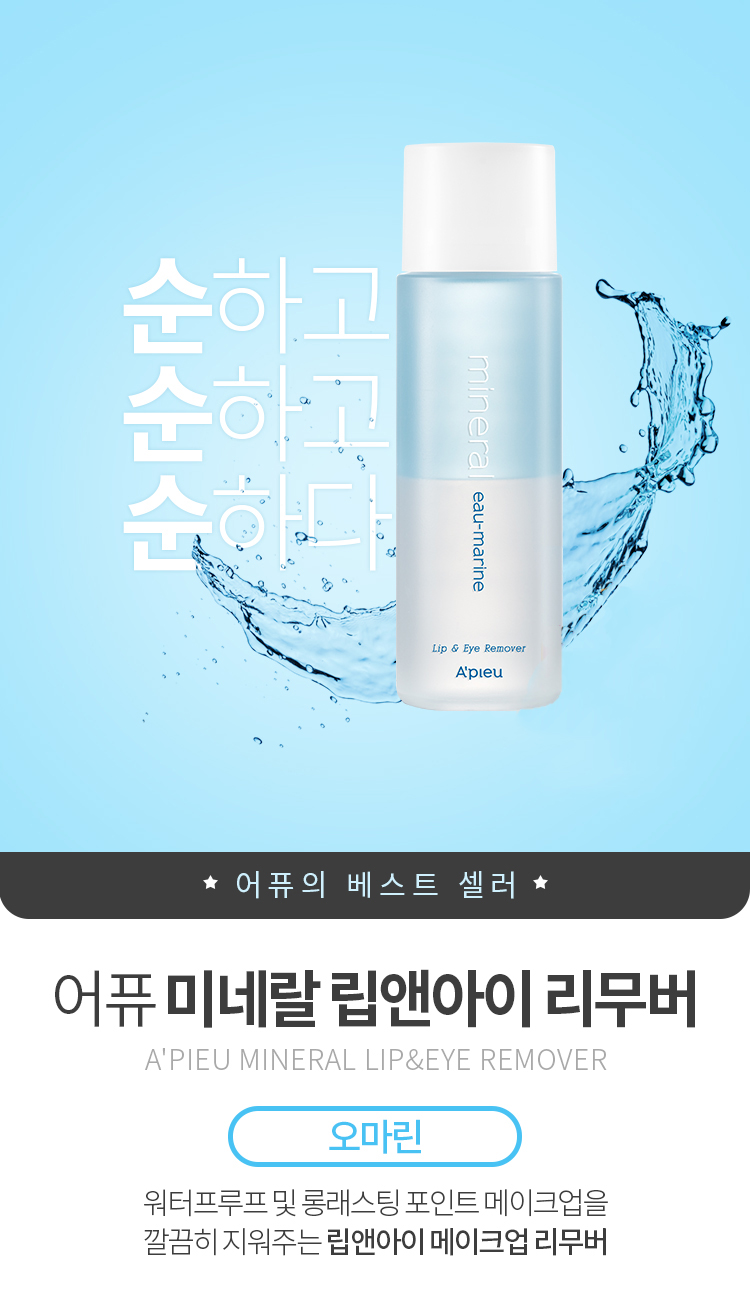 The A’PIEU Ear-Mirine Lip & Eye Remover is a mild two-phase remover that removes all types of makeup around the sensitive eye and lip areas. Mineral-rich thermal water moisturises the delicate eye area and lips to prevent dryness after cleansing. This gentle formula is created to give protection to the sensitive skin around your eyes and mouth, while removing even waterproof makeup effortlessly. Suitable for all skin types.