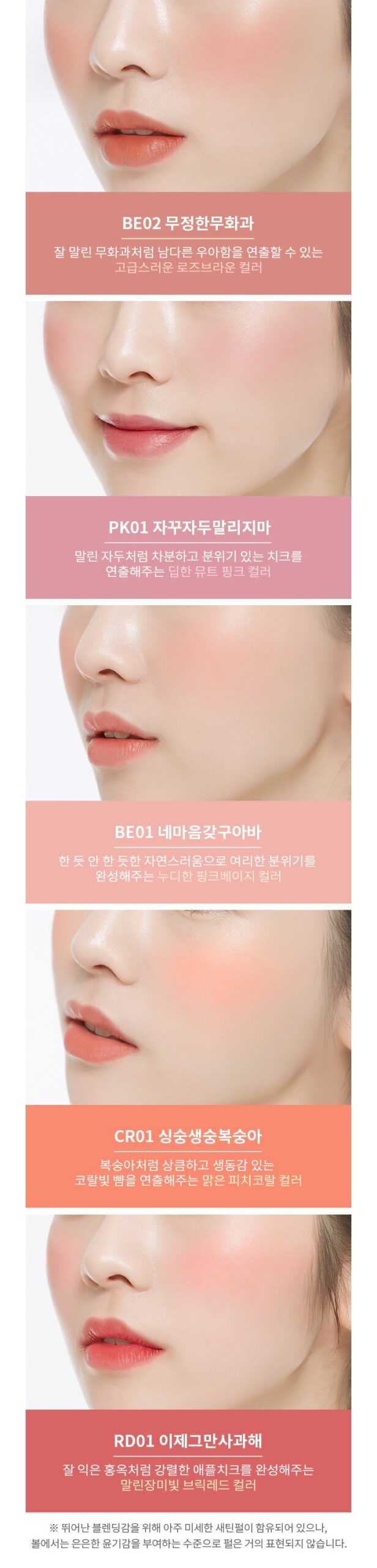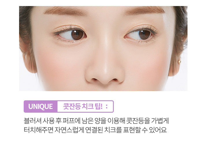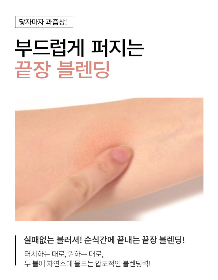 After taking an appropriate amount using your fingers, gently tap onto both cheeks. Lightly blend for a natural, soft flush. The overwhelming blending power ensures both cheeks are stained naturally with just a touch!