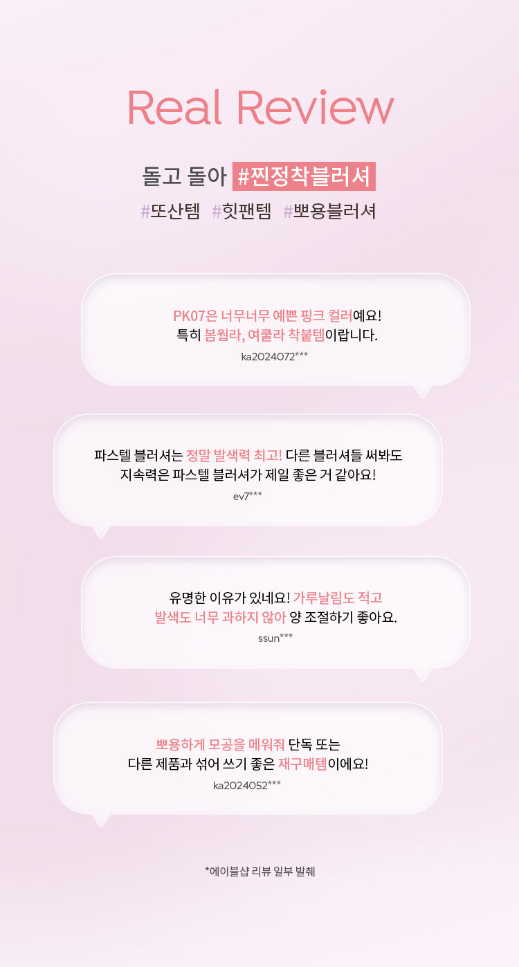 لقد أحببت جمالية بلشر A’PIEU! يوفر توهجا طبيعيا لم يسبق له مثيل. تنساب الألوان بسلاسة وتظهر مكافحتها للبقع والتحكم في الزيوت مدهشًا، ولا أفكر بتبديله قريباً.