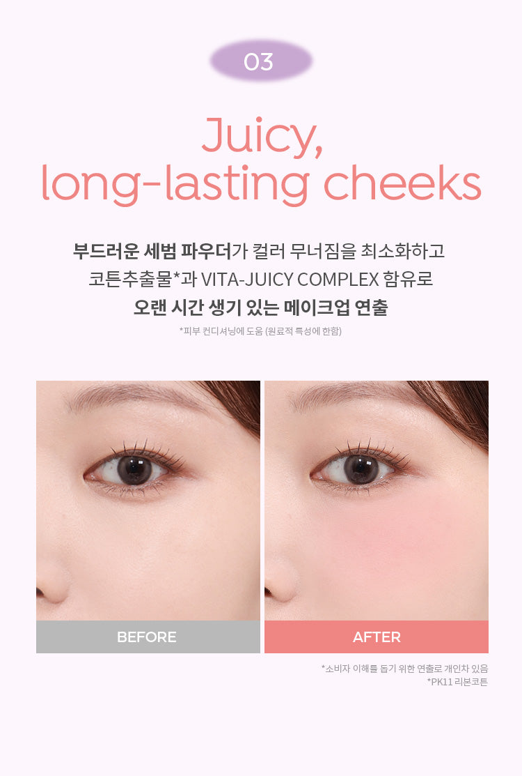 Formulated with Sebum-Control Powder, Cotton Extract, and the VITA-JUICY COMPLEX, it helps reduce oiliness, maintains vivid color, and keeps skin feeling fresh and balanced throughout the day.