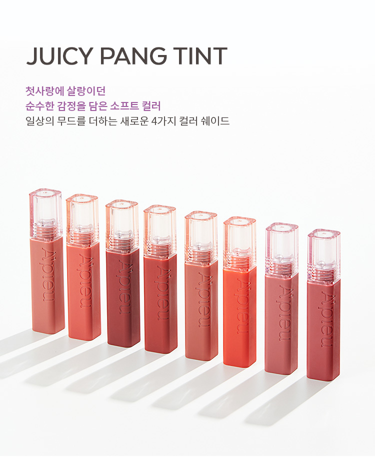 Get juicy, vibrant lips with APIEU Juicy Pang Tint. These matte lip tints feature the signature APIEU square tube design with embossed branding. Available in 6 beautiful shades from soft pink to bold red, each delivers rich color with a comfortable matte finish.