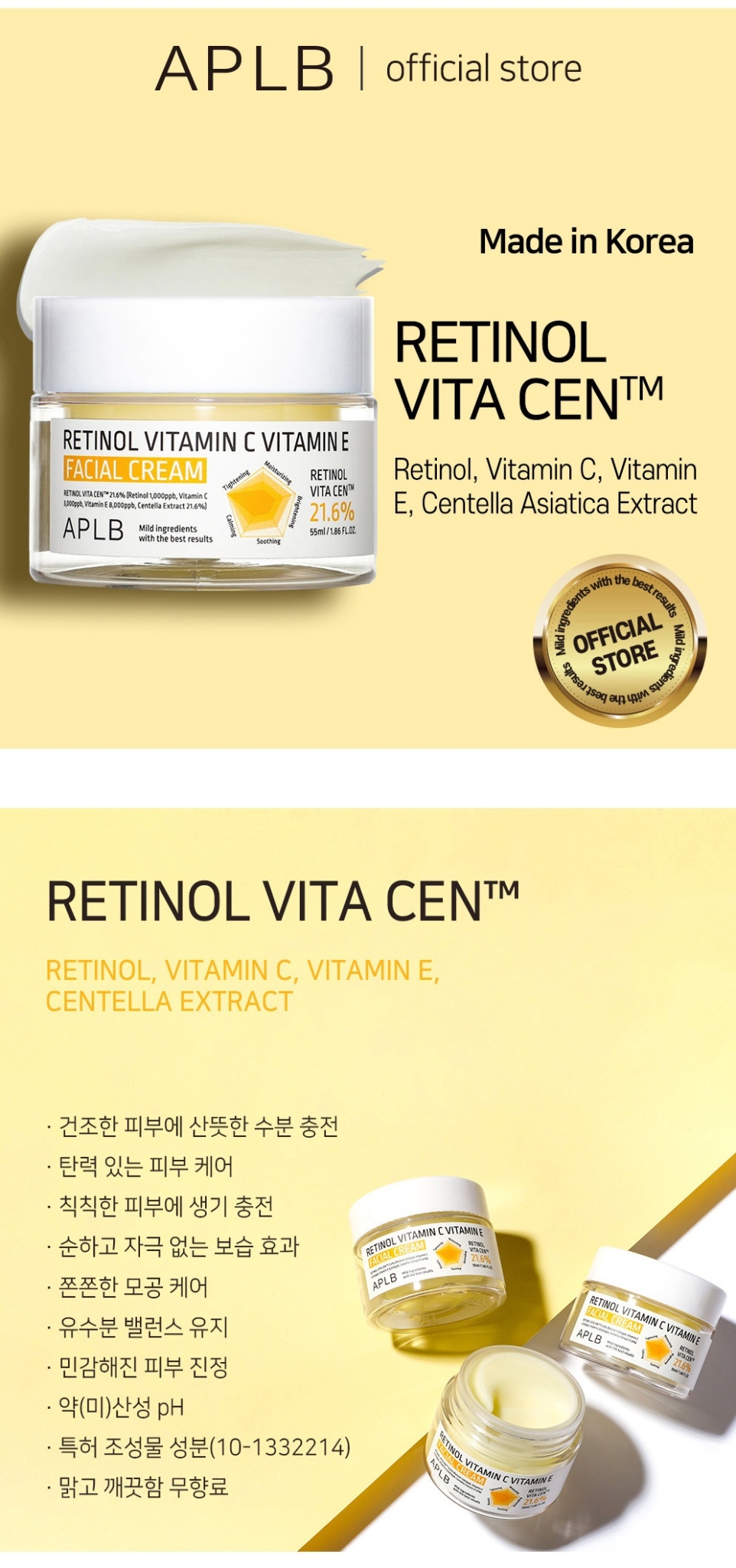 The APLB Retinol Vitamin C Vitamin E Facial Cream is a do-it-all face cream that provides anti-ageing, brightening and soothing benefits. Formulated with RETINOL VITA CEN™ (a blend of Retinol, Vitamin C, Vitamin E and Cica Extract), this cream tackles signs of skin ageing and gives skin a radiance boost while keeping skin soothed and moisturised.