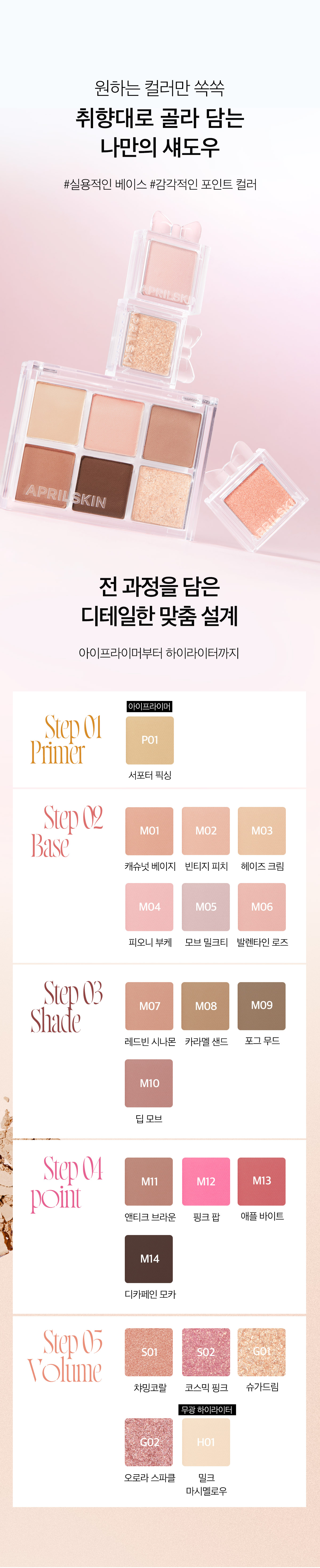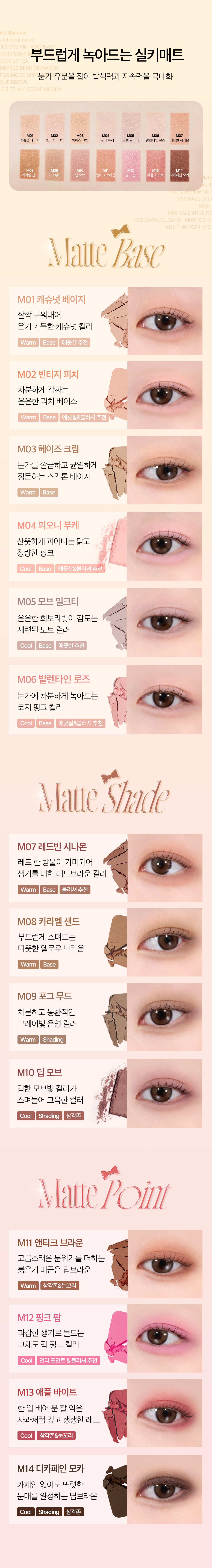 | Step 02 | Base (Matte) | M01 Cashmere Beige, M02 Vintage Peach, M03 Haze Cream, M04 Peony Bouquet, M05 Mauve Milky Tea, M06 Valentine Rose | Matte Eyeshadow |