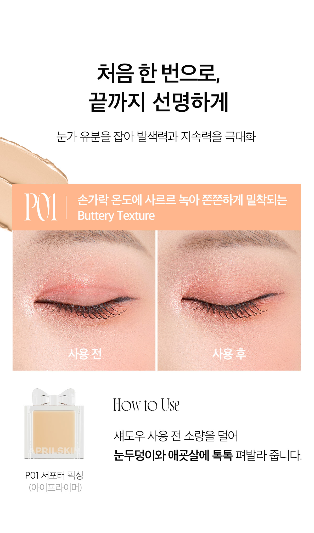 Before applying eyeshadow, take a small amount of P01 Supporter Fixing and gently dab it onto your eyelids and aegyo-sal (under-eye bags) for enhanced color and wear.