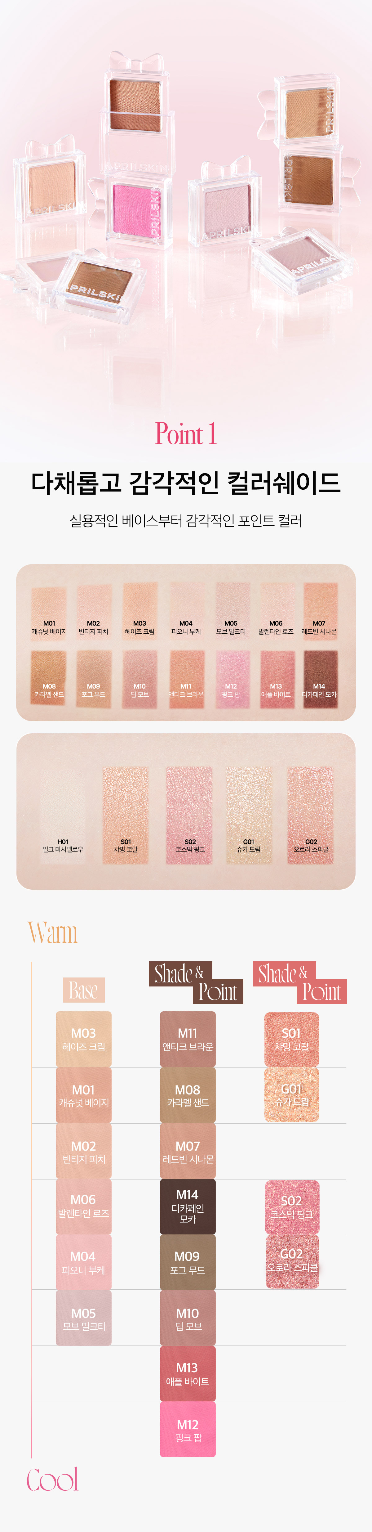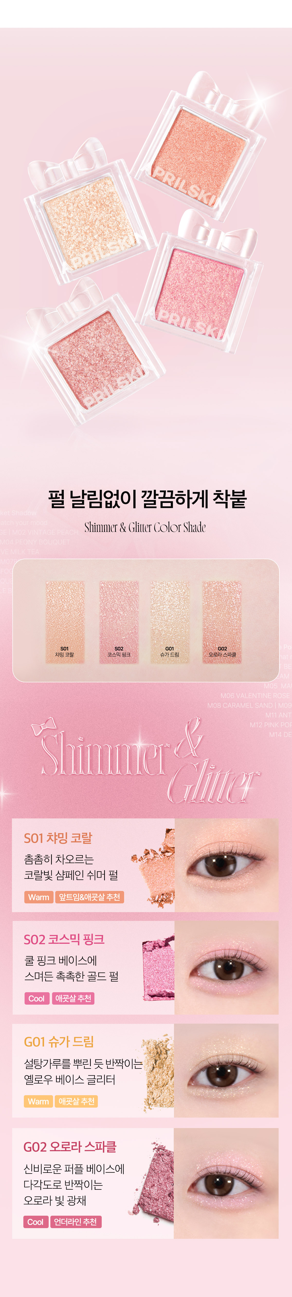 | S01 | Charming Coral | A dense coral champagne shimmer pearl for a radiant glow. | Warm / Point & Aegyo-sal |