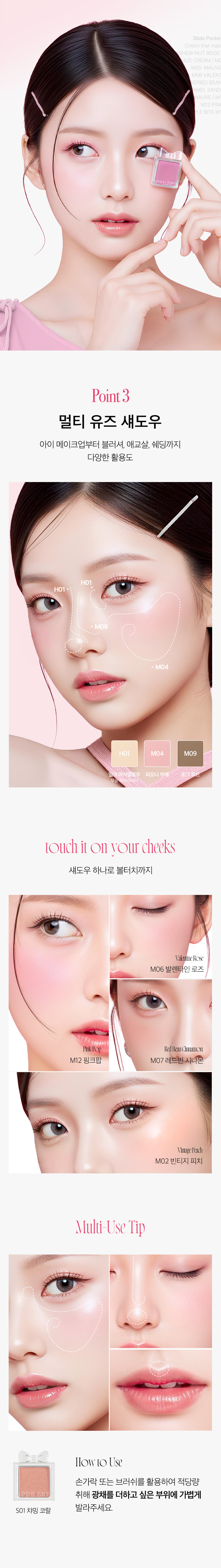 | Step 04 | Point (Matte) | M11 Antique Brown, M12 Pink Pop, M13 Apple Bite, M14 Decaffeinated Mocha | Matte Eyeshadow |