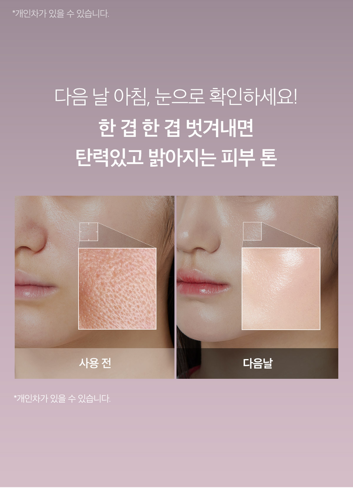 Check with your own eyes the next morning! When you peel off layer by layer, your skin tone becomes elastic and brighter.