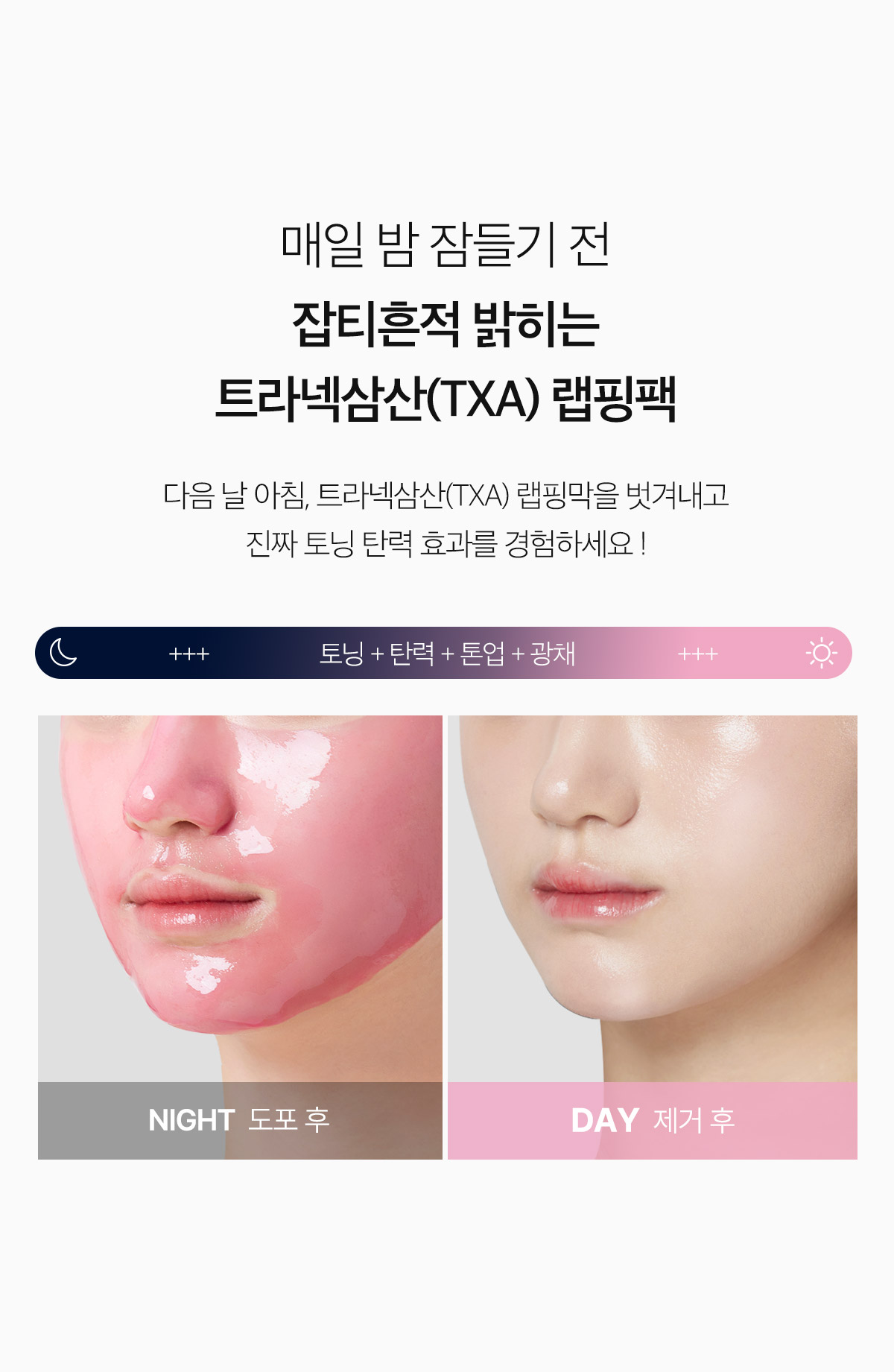 Every night before sleep, apply the Tranexamic Acid (TXA) Wrapping Pack to brighten blemish traces. The next morning, peel off the Tranexamic Acid (TXA) wrapping film and experience real toning and elasticity effects!