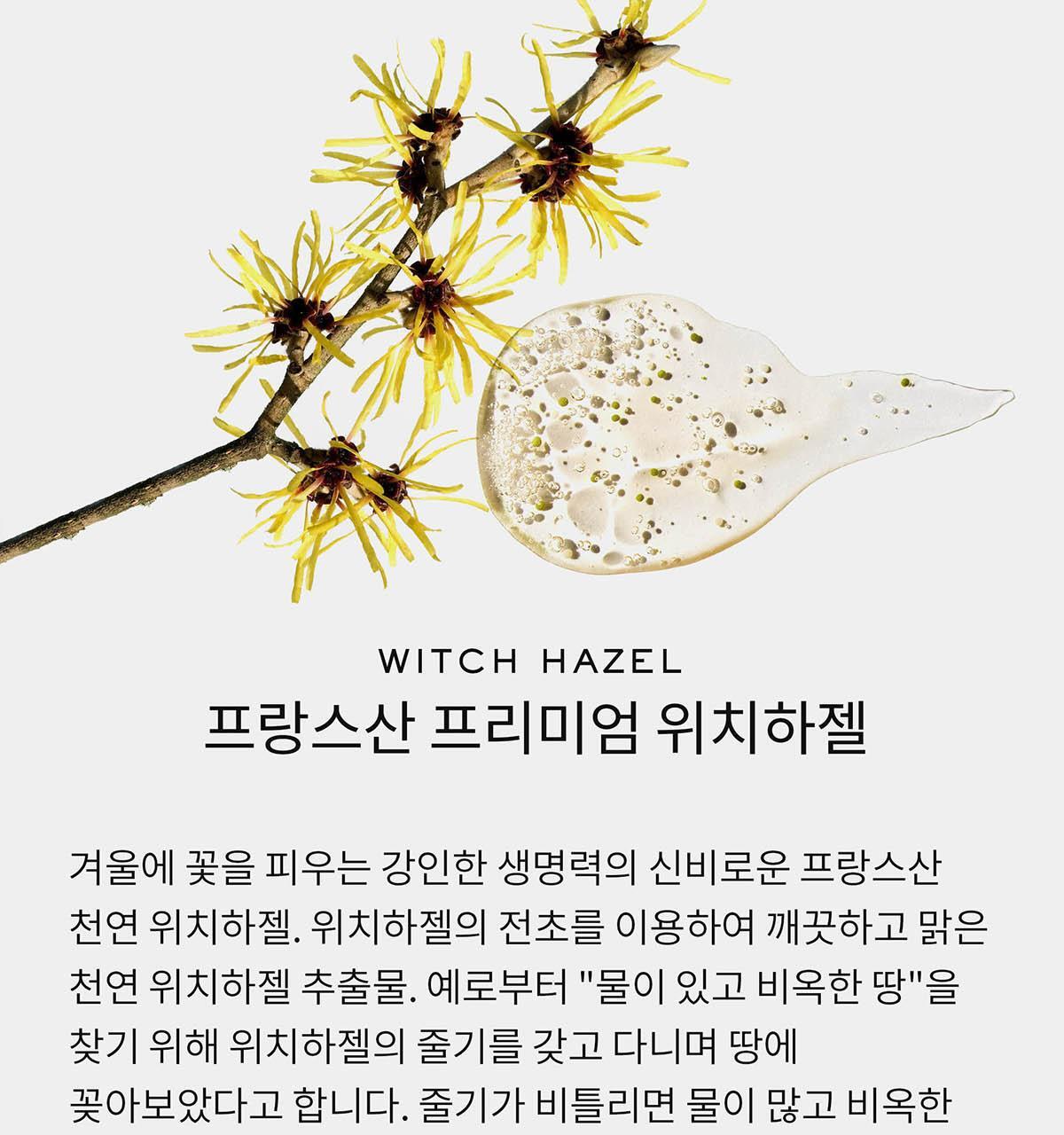 - French Premium Witch Hazel: Derived from flowers, leaves, stems, and roots, it soothes and refines the skin.