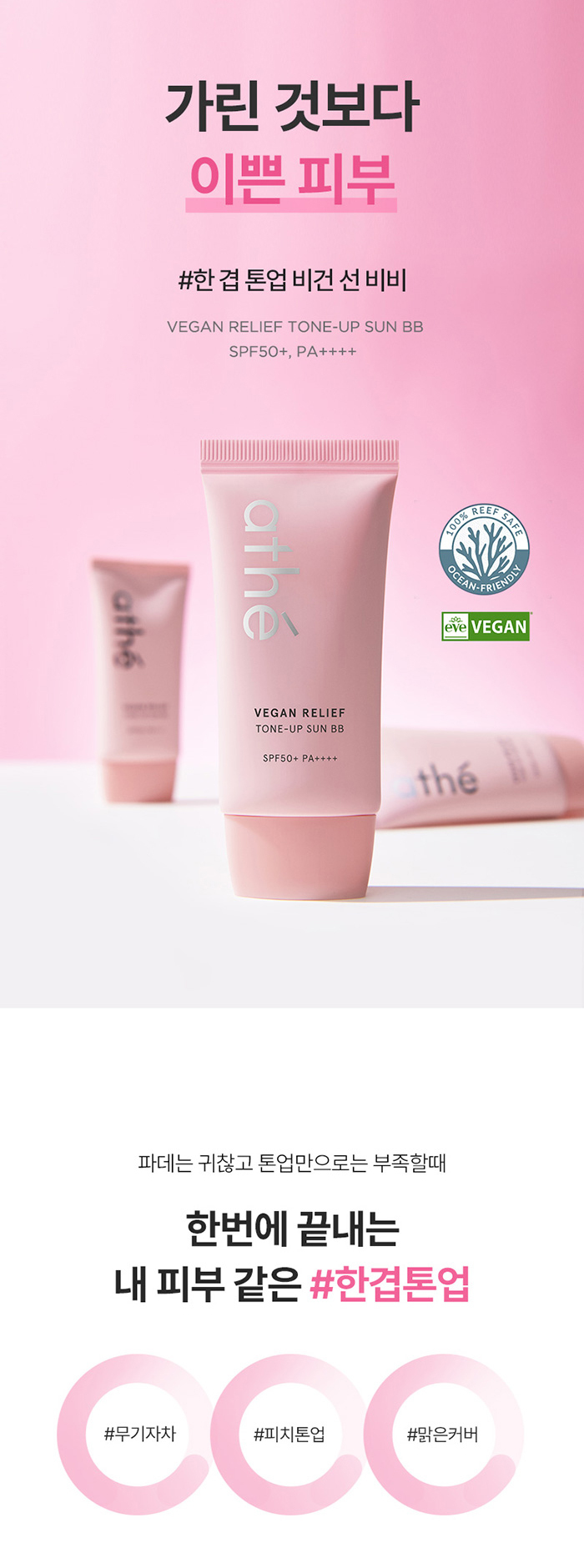 We take pride in our commitment to ethical beauty standards and environmental responsibility. The Athe Vegan Relief Tone Up Sun BB is certified by the globally recognized French EVE Vegan organization, ensuring it meets strict vegan criteria. Additionally, our reef-safe formula is designed to prevent coral bleaching, making it a conscientious choice for eco-aware consumers.