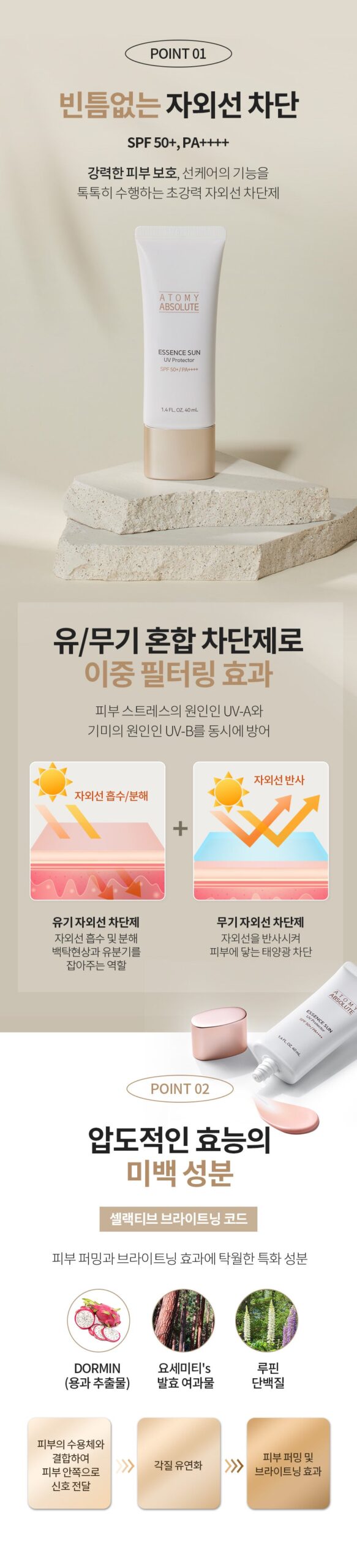 Living in the vibrant atmosphere of New Orleans, I can’t help but admire Atomy’s Absolute Essence Sun. It embodies what sun protection should be – robust and lightweight. The sheer texture glides onto my face effortlessly without a sticky residue; perfect for our humid summers! Knowing it offers SPF50+ with dual action really eases any sunscreen apprehension while reveling in local festivals under the scorching southern sun. Besides effective UV shielding, there’s this subtle brightening that seems almost ethereal, enhancing rather than masking skin tone – very much an echo of Mardi Gras spirit through vivacious hues yet oh-so-genuine!