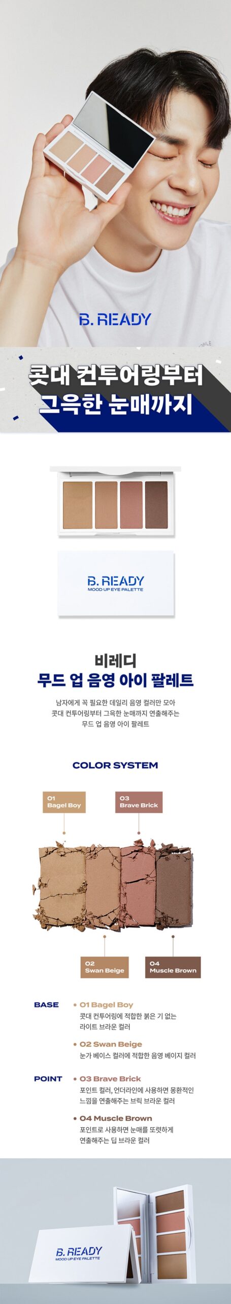 Elevate your everyday look with the B.READY for Men Mood Up Eye Palette, specifically designed to meet the unique needs of men. From subtle nose contouring to creating captivating eyes, this palette includes essential daily shades for versatile, natural makeup.